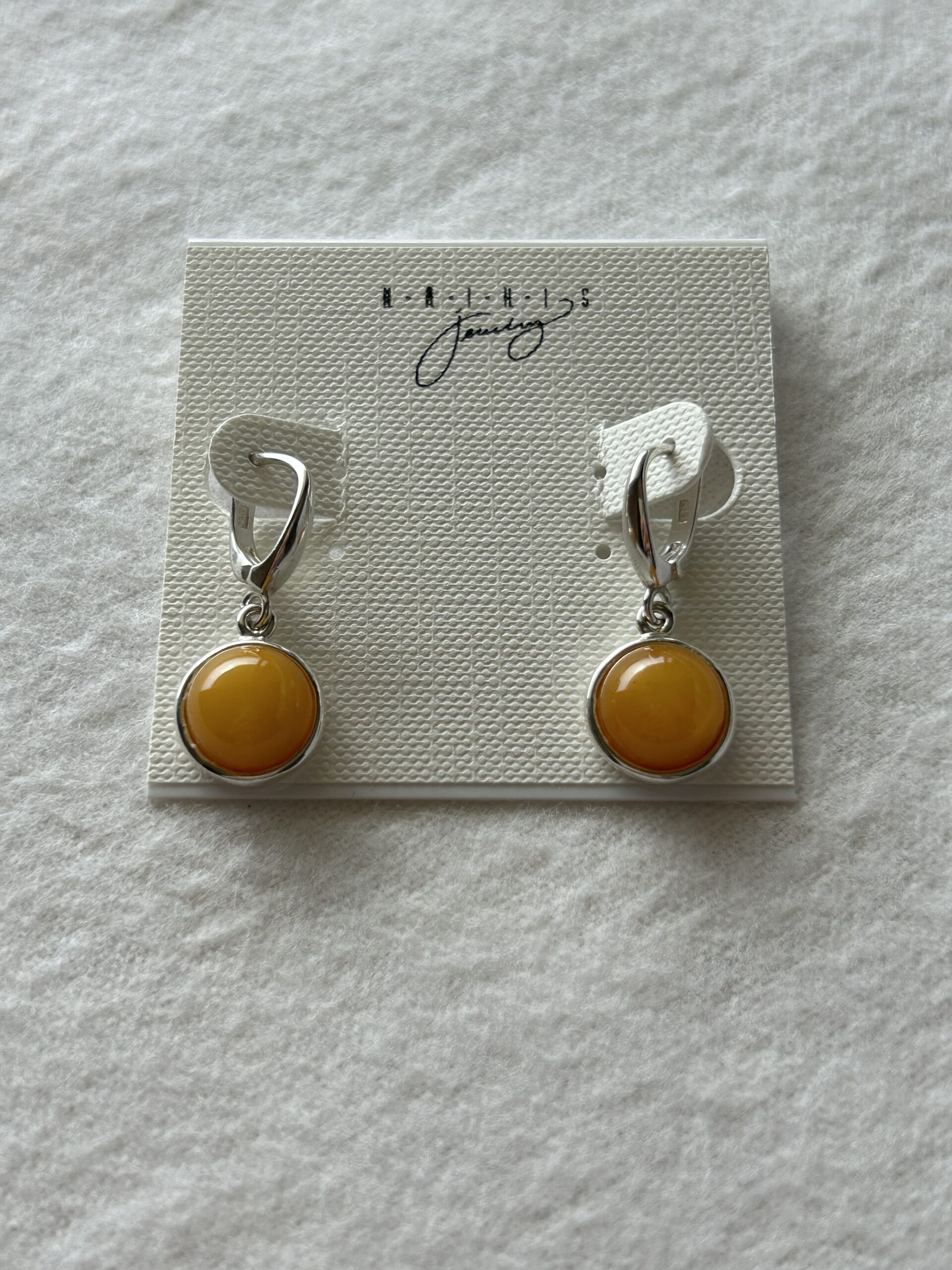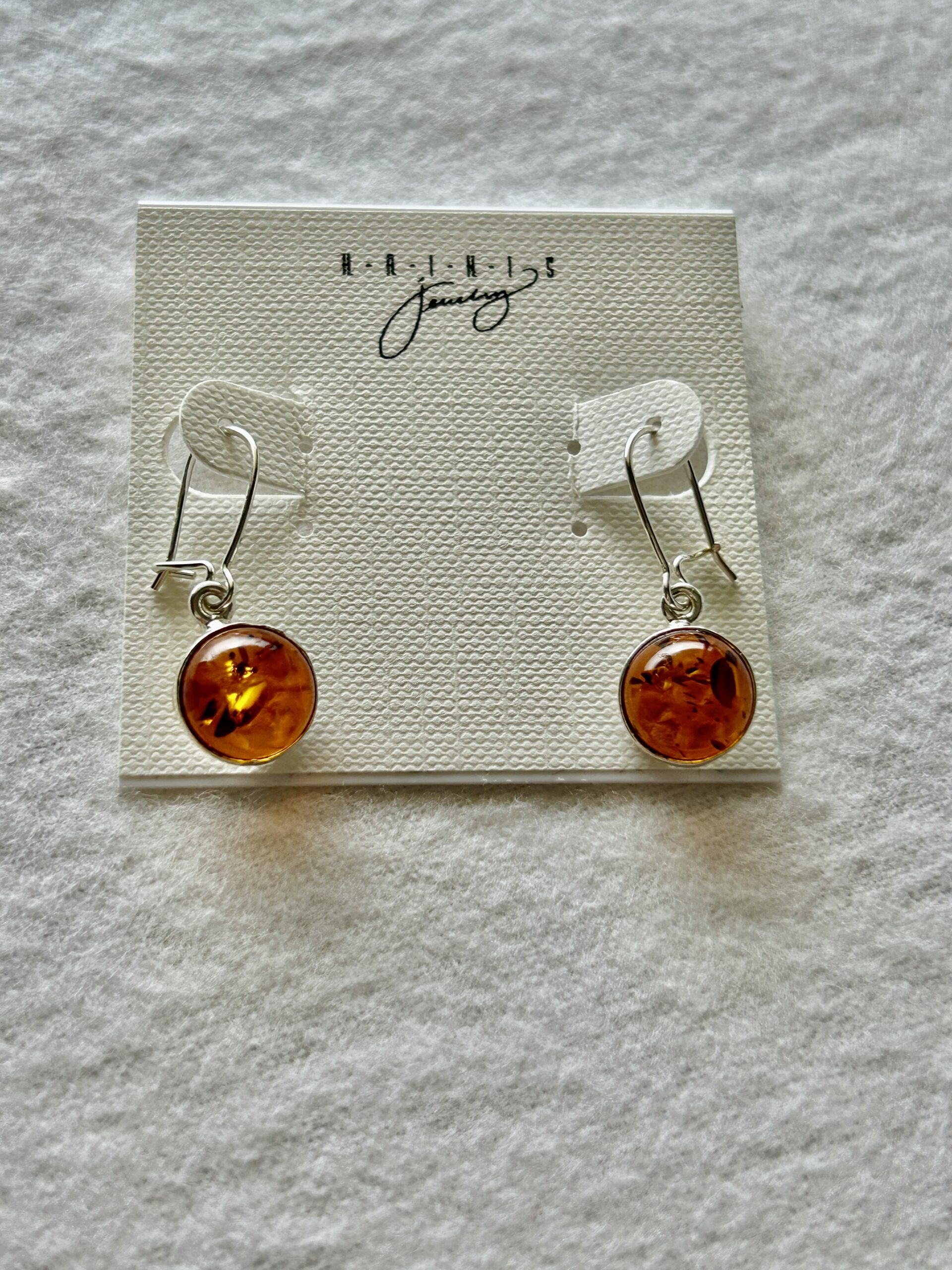This sterling silver pair is set with butterscotch or honey/cognac color Baltic amber. The earrings are approximately .50 inch long excluding the sterling ear wire.