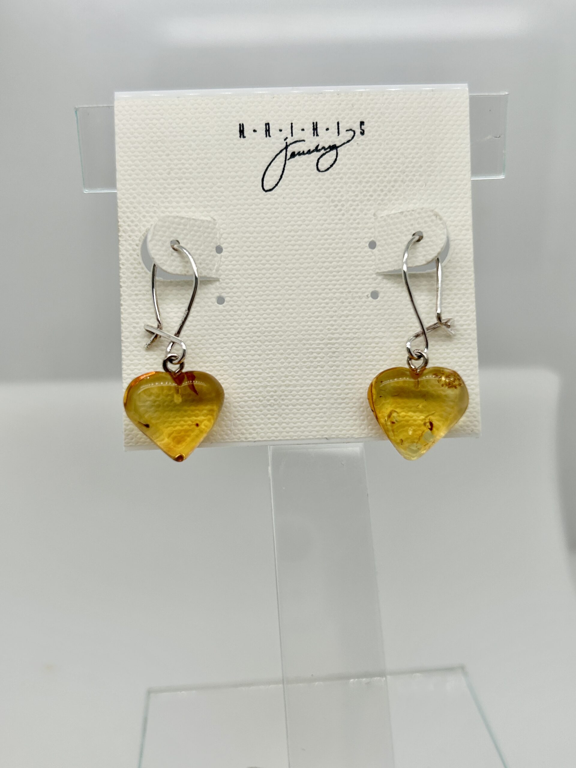 This pair of sterling silver earring posts have a beautiful Baltic Amber heart dangle. The earrings are approximately .75 inches long including the post.