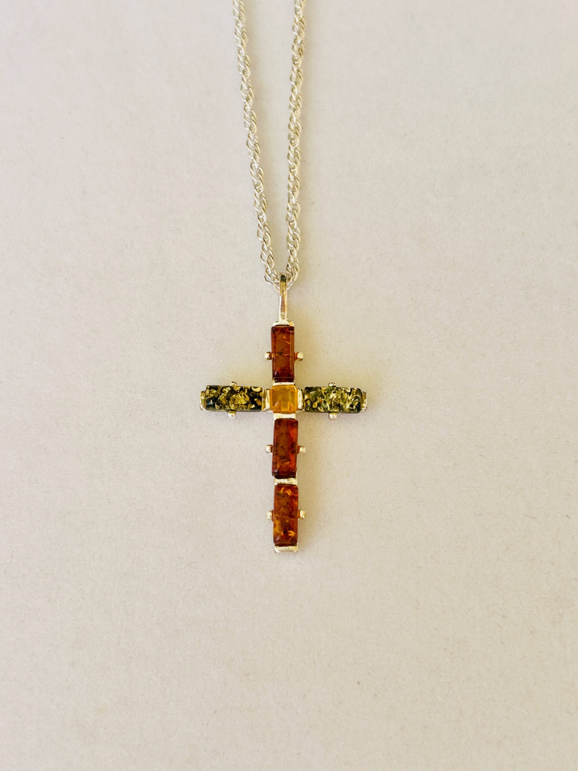 The sterling silver cross has six (6) Baltic ambers of various colors. The cross is approximately 1.25 inches long excluding the bail. Ambers may vary in color from the pic.