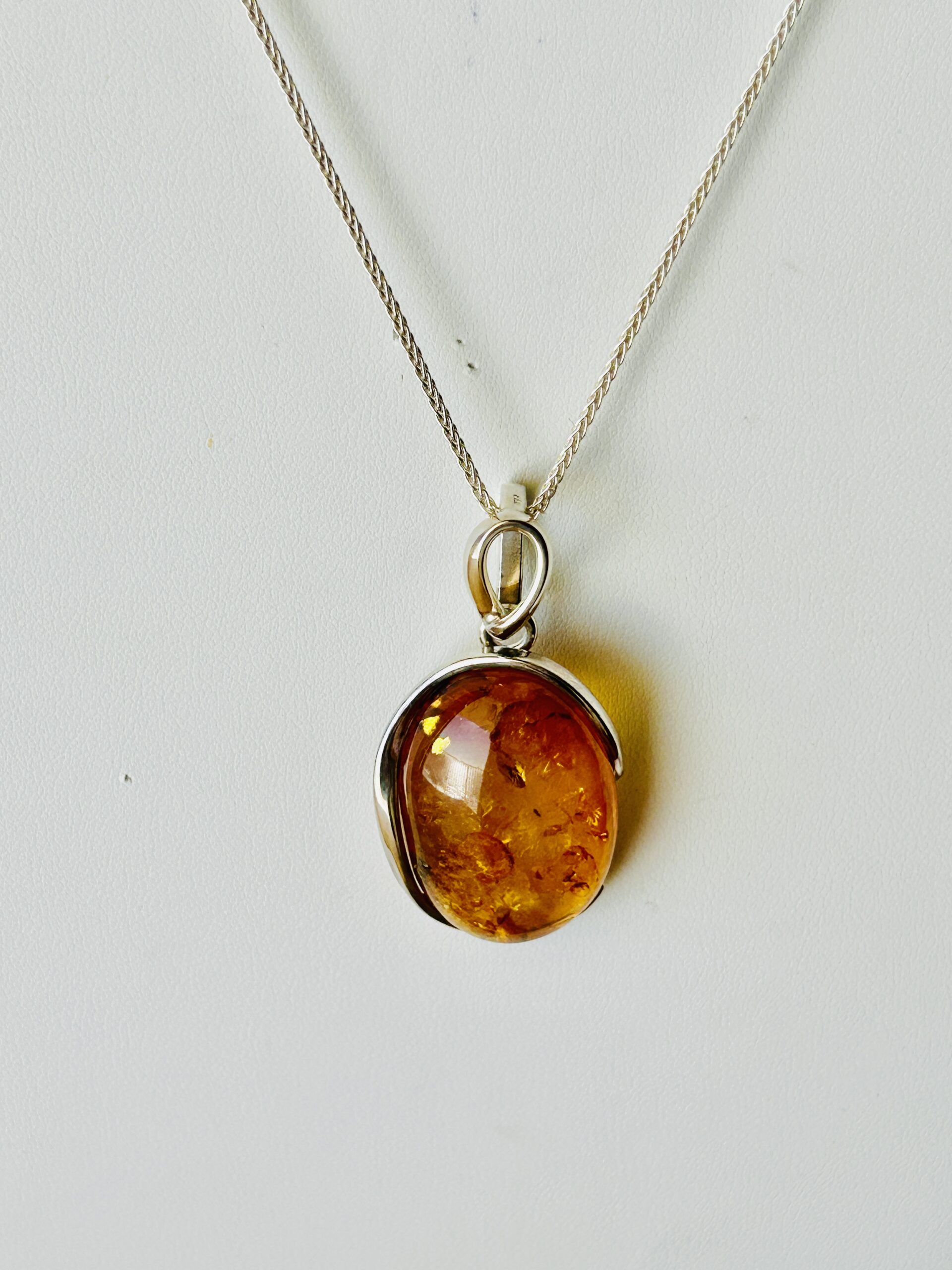 This sterling silver pendant is set with a lovely honey color Baltic amber. The pendant is approximately 1.25 x .75 inches and comes with a twenty (20) inch chain.