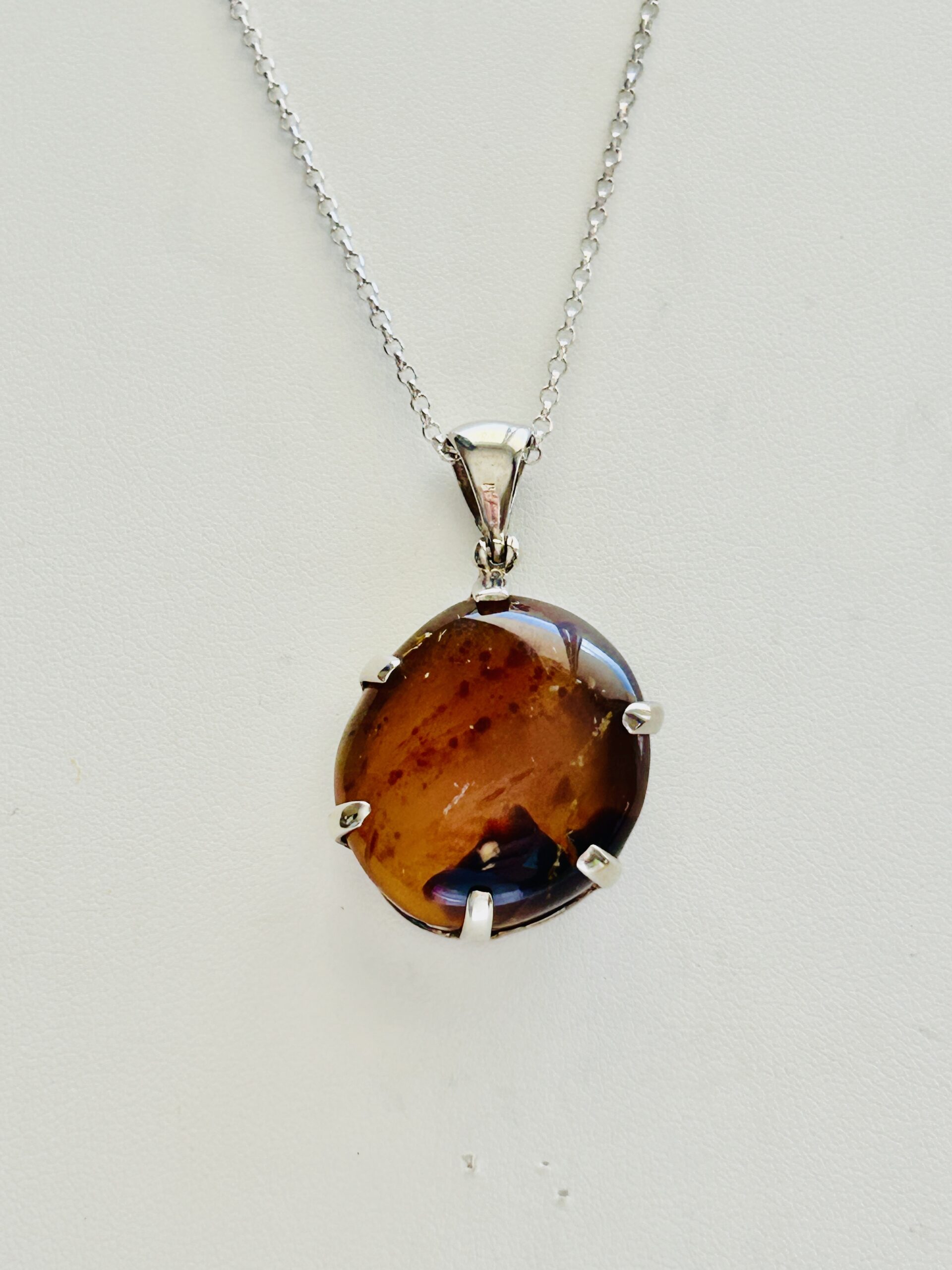 This natural Blue amber is cognac color with natural inclusions under normal light but shows blue under a black light. The amber is set into a sterling silver prong setting that is approximately 1.50 inches (bail included) and comes with a sterling chain.