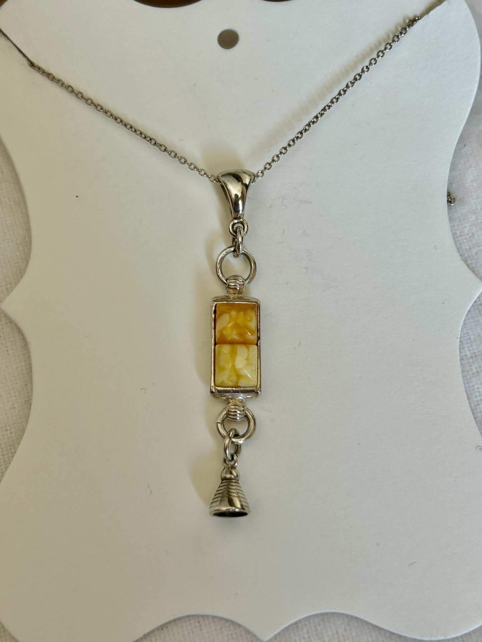 This sterling silver pendant is approximately two (2) inches long and is set with two natural Baltic ambers and further enhanced with a small Latvian castle charm.
