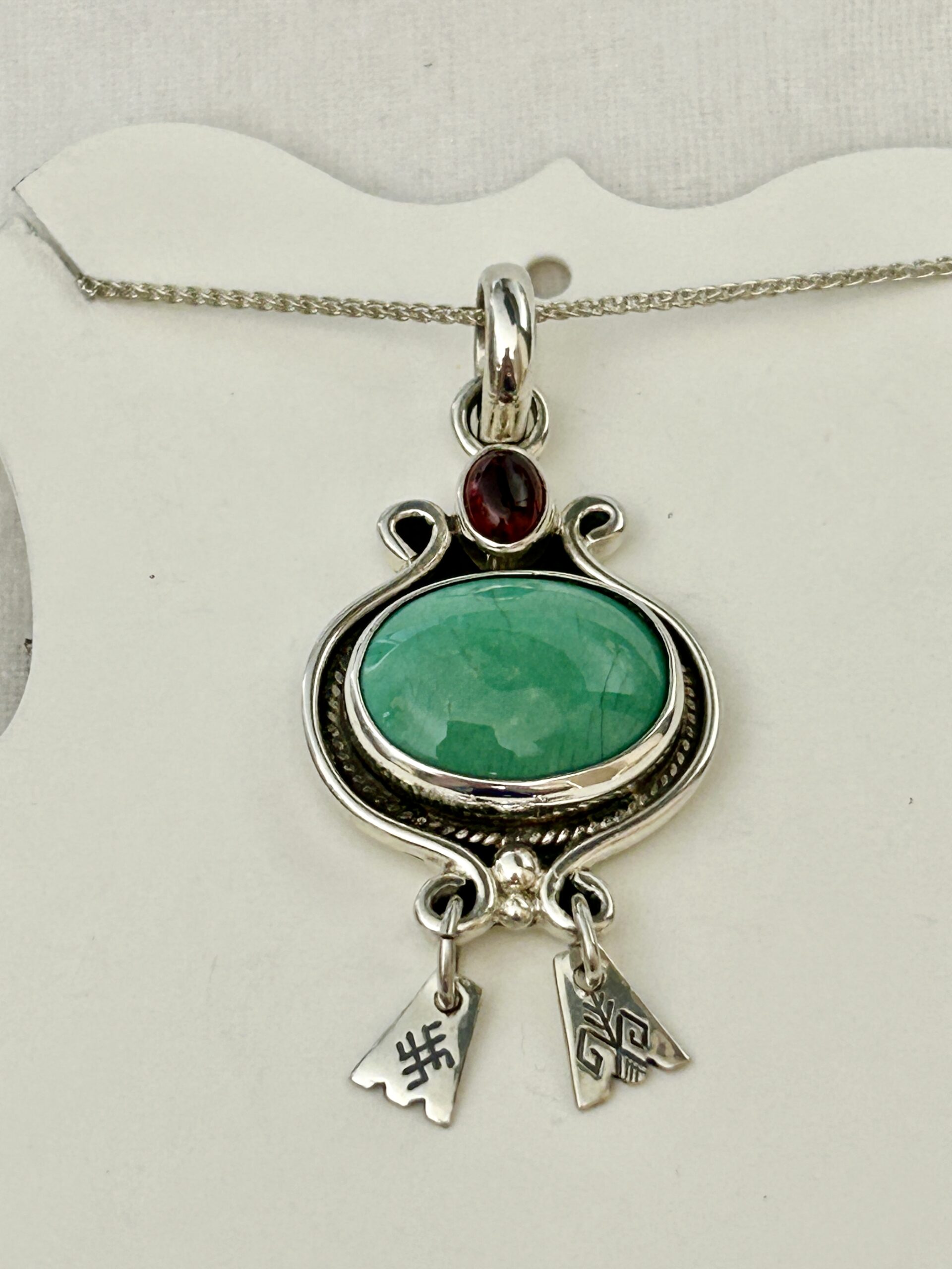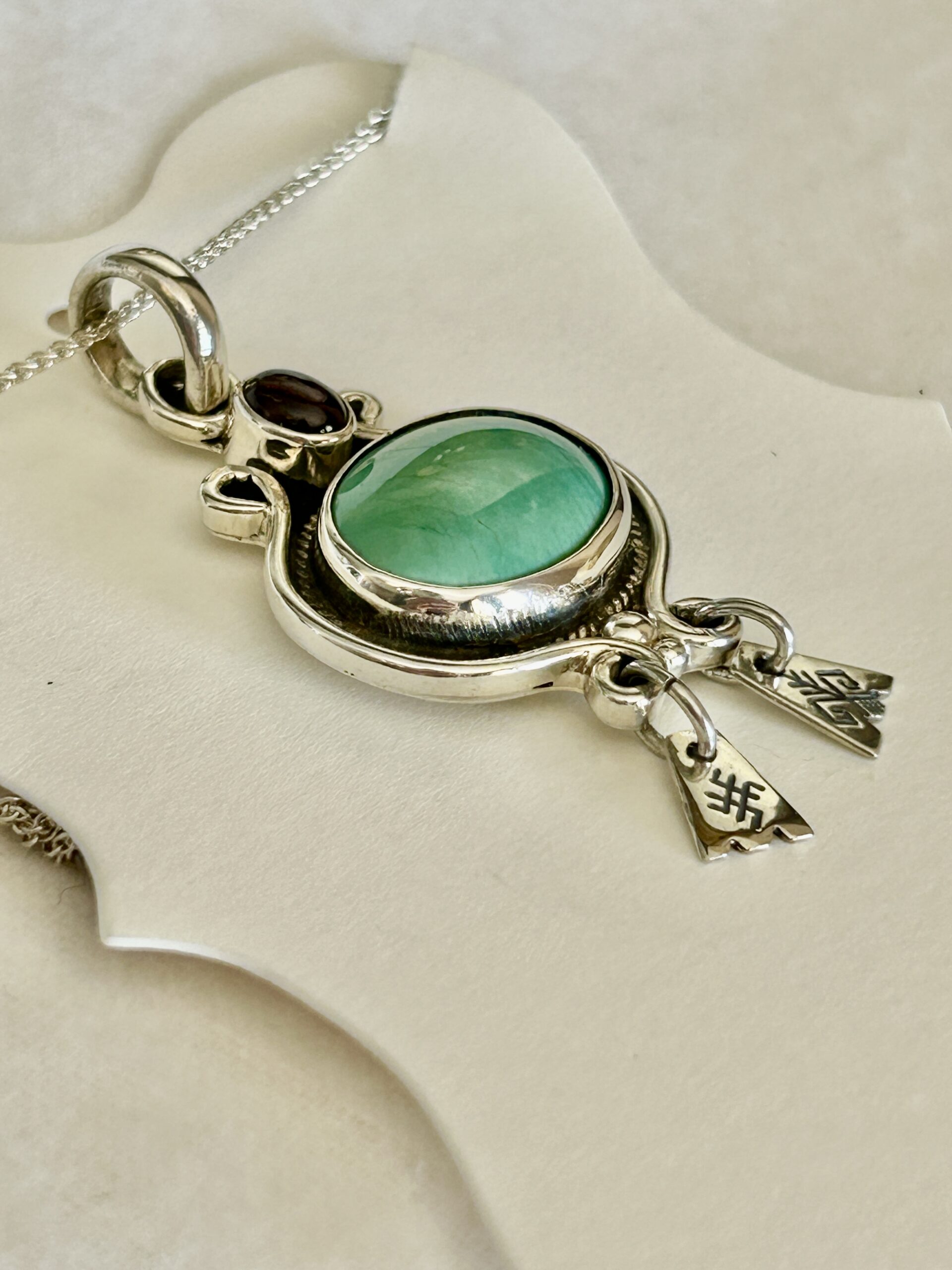 This beautiful sterling silver pendant is set with a genuine Chrysoprase and deep red garnet cabochon and is further enhanced by two Baltic charms. The pendant is approximately 2.25 inches long and comes with a sterling chain.