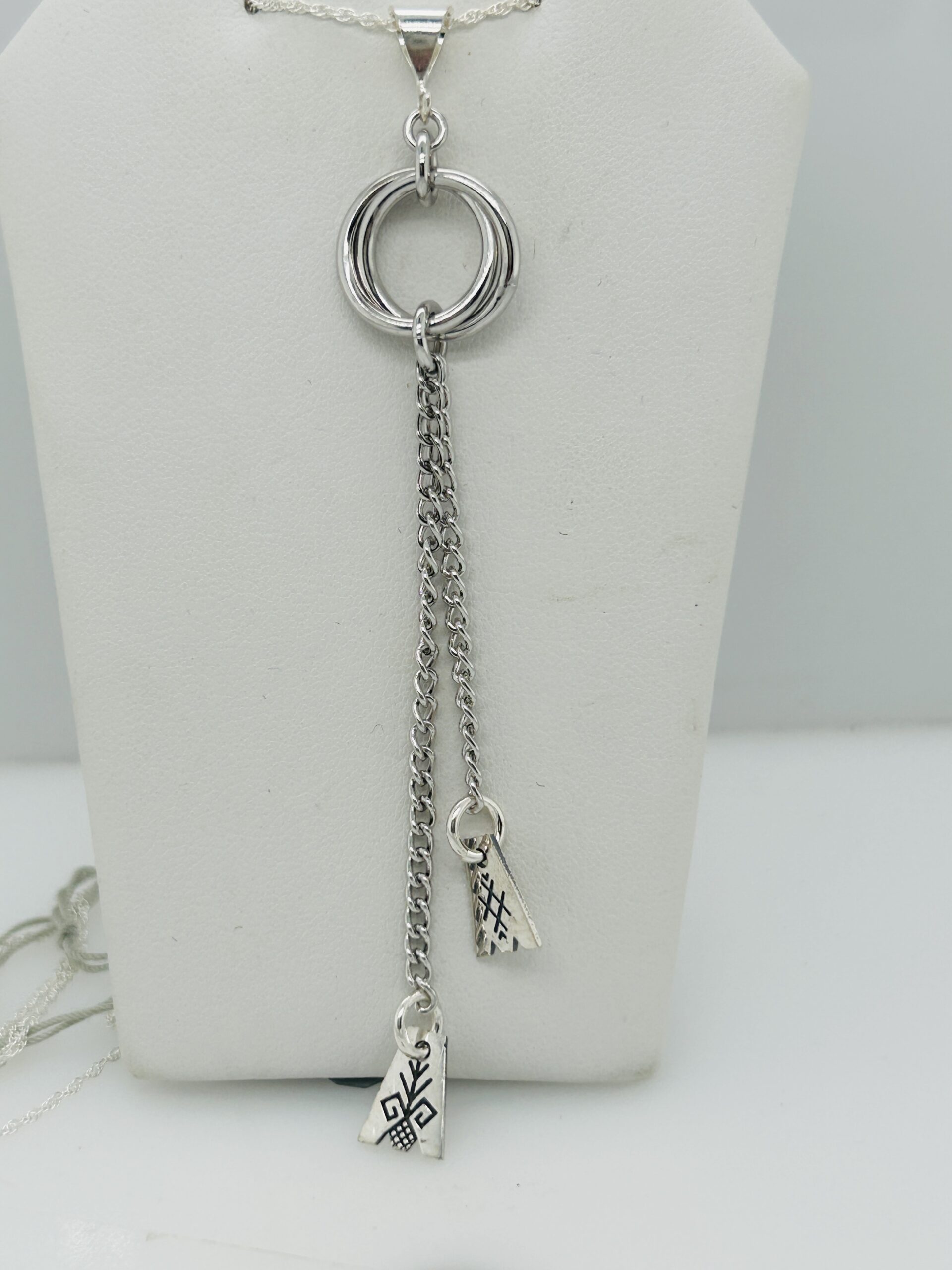 The sterling silver pendant has two (2) entwined silver circles that have two (2) cascading chains with small Baltic charms. The pendant is approximately 3.5 inches long including the bail. An eighteen (18) inch chain is included.