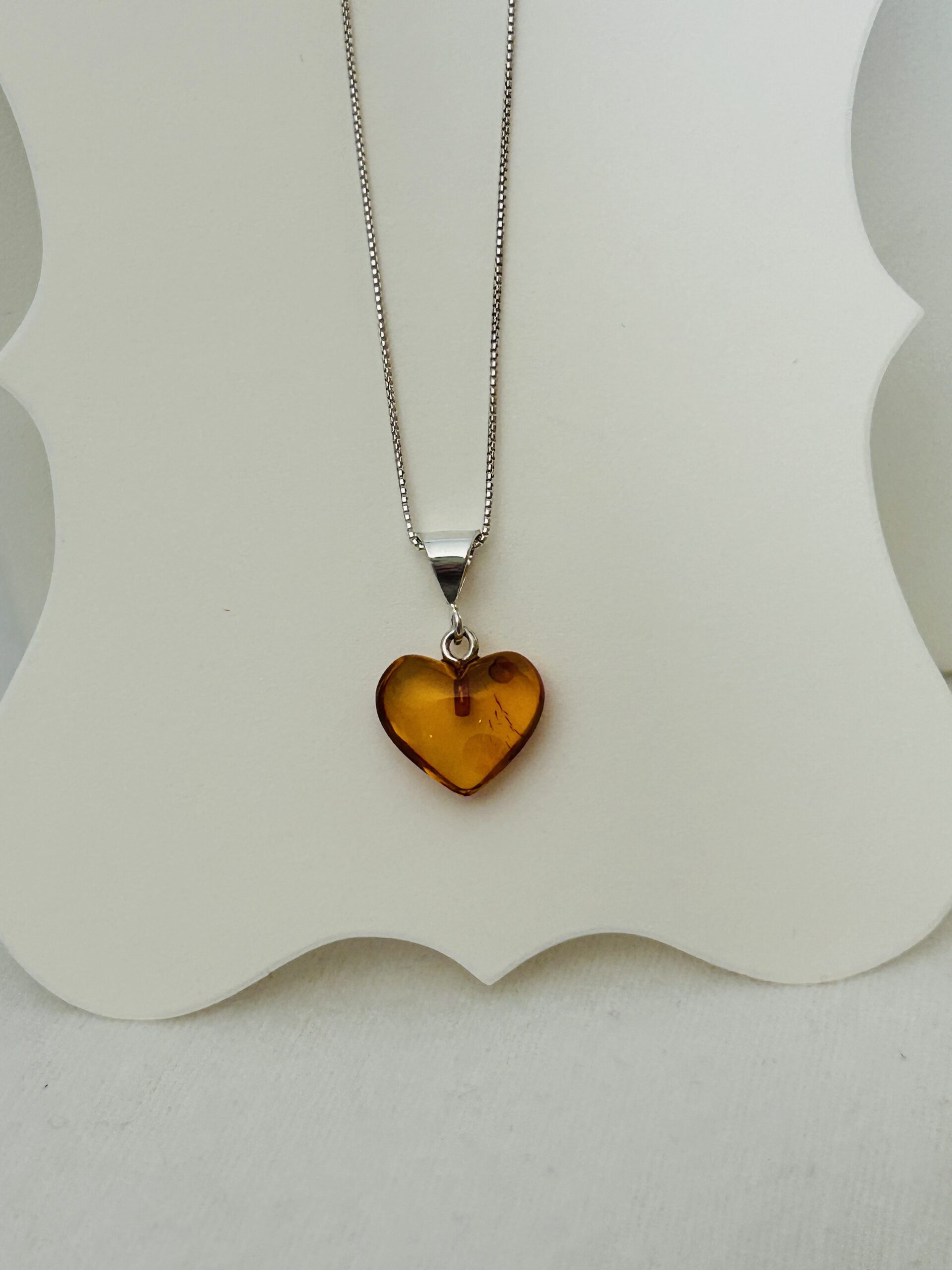 This beautiful cognac color Baltic heart pendant, has a sterling silver bail and eighteen (18) inch long chain.