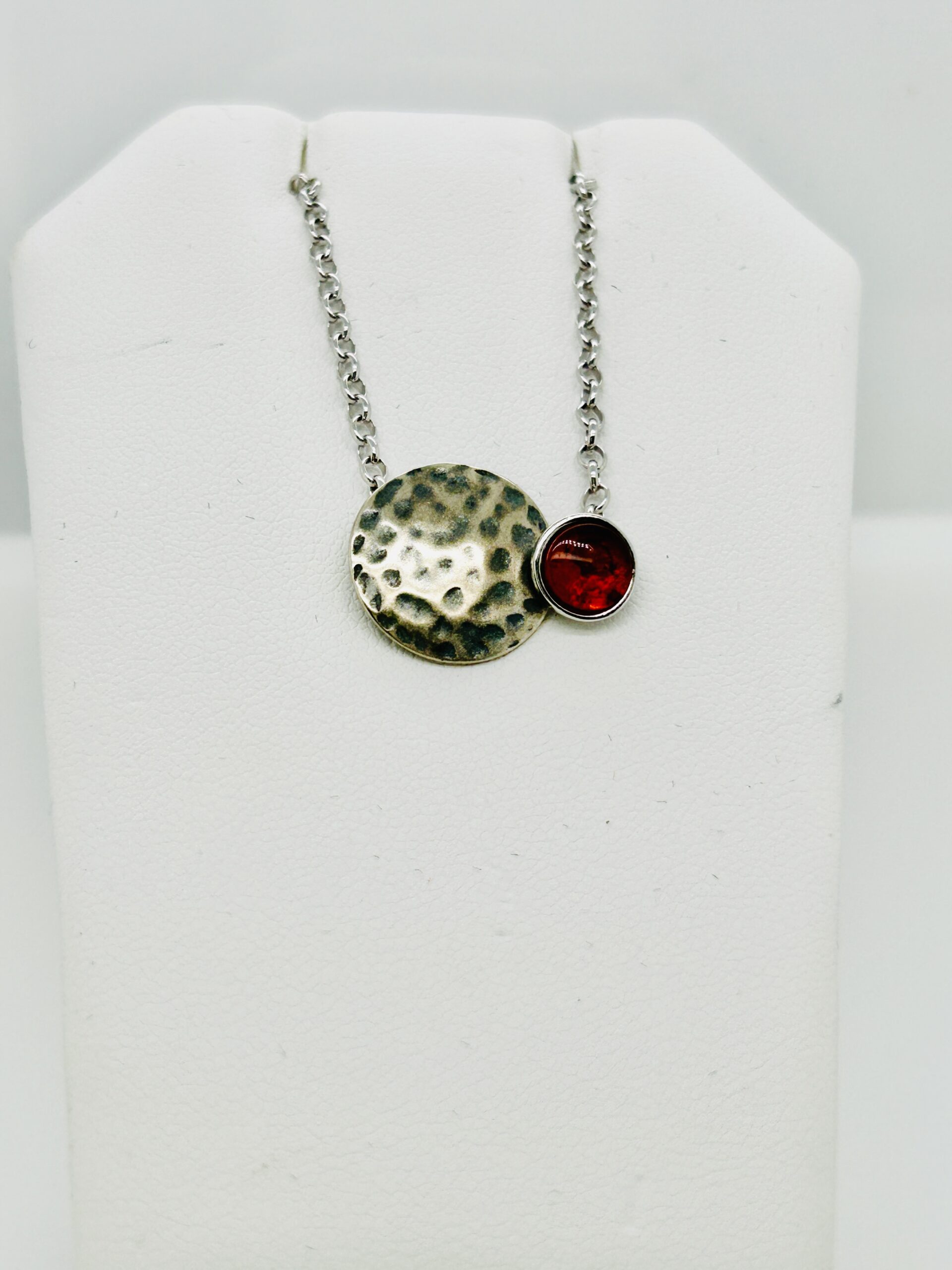 The sterling silver pendant is adjustable between eighteen (18) and twenty (20) inches. The contemporary hammered disk is further enhanced by a round Baltic amber. The pendant is approximately .75 x .50 inches.