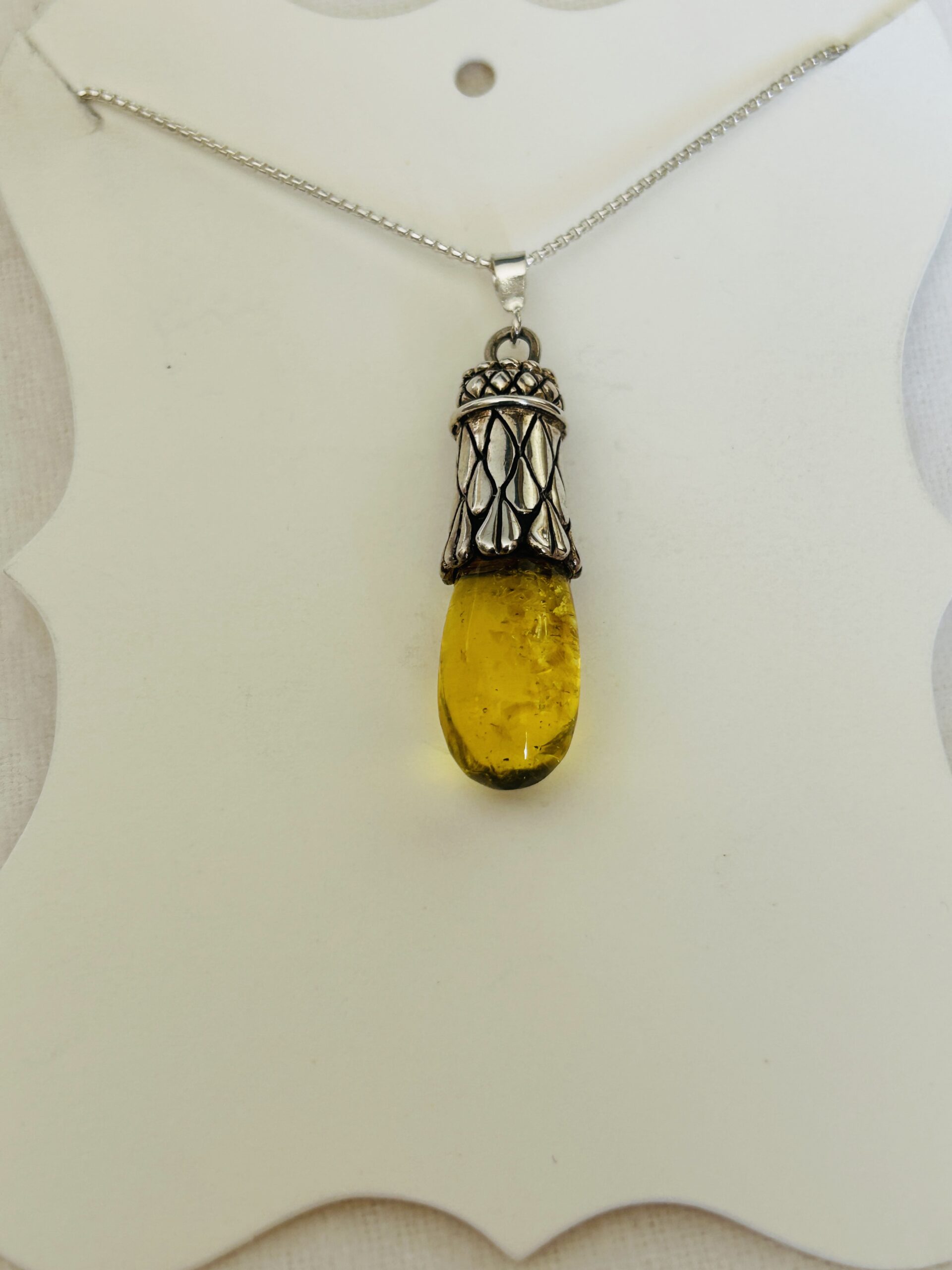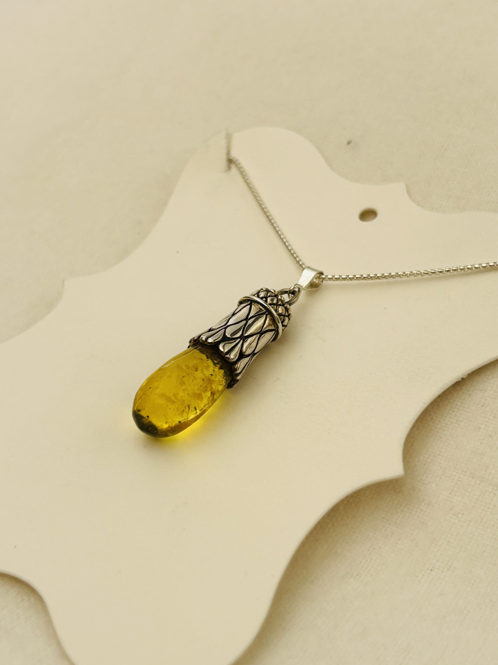 The teardrop honey amber is encased with a sterling silver crown design housing. The pendant is approximately 1.25 inches long excluding the bail and comes with a sterling silver chain.