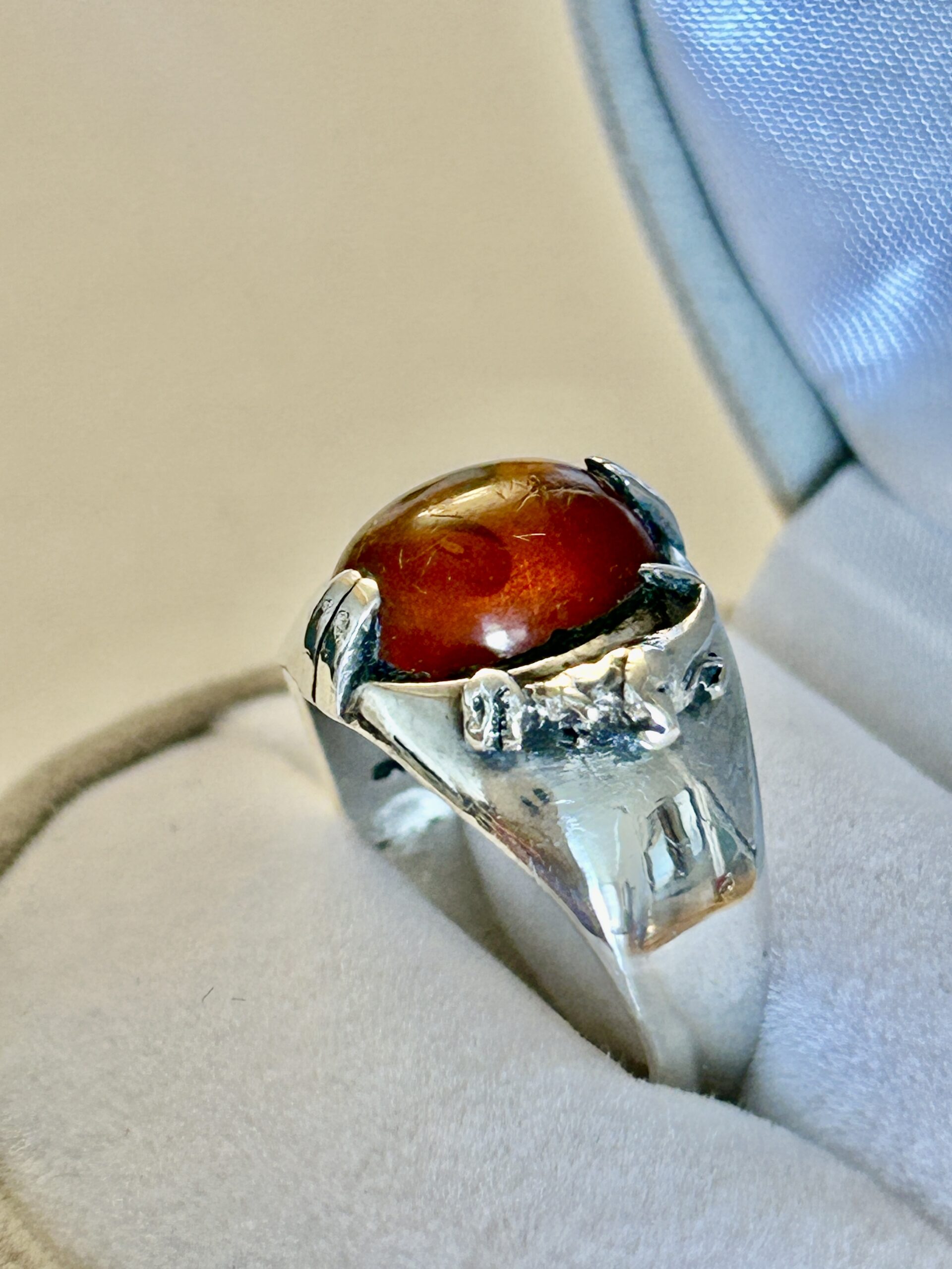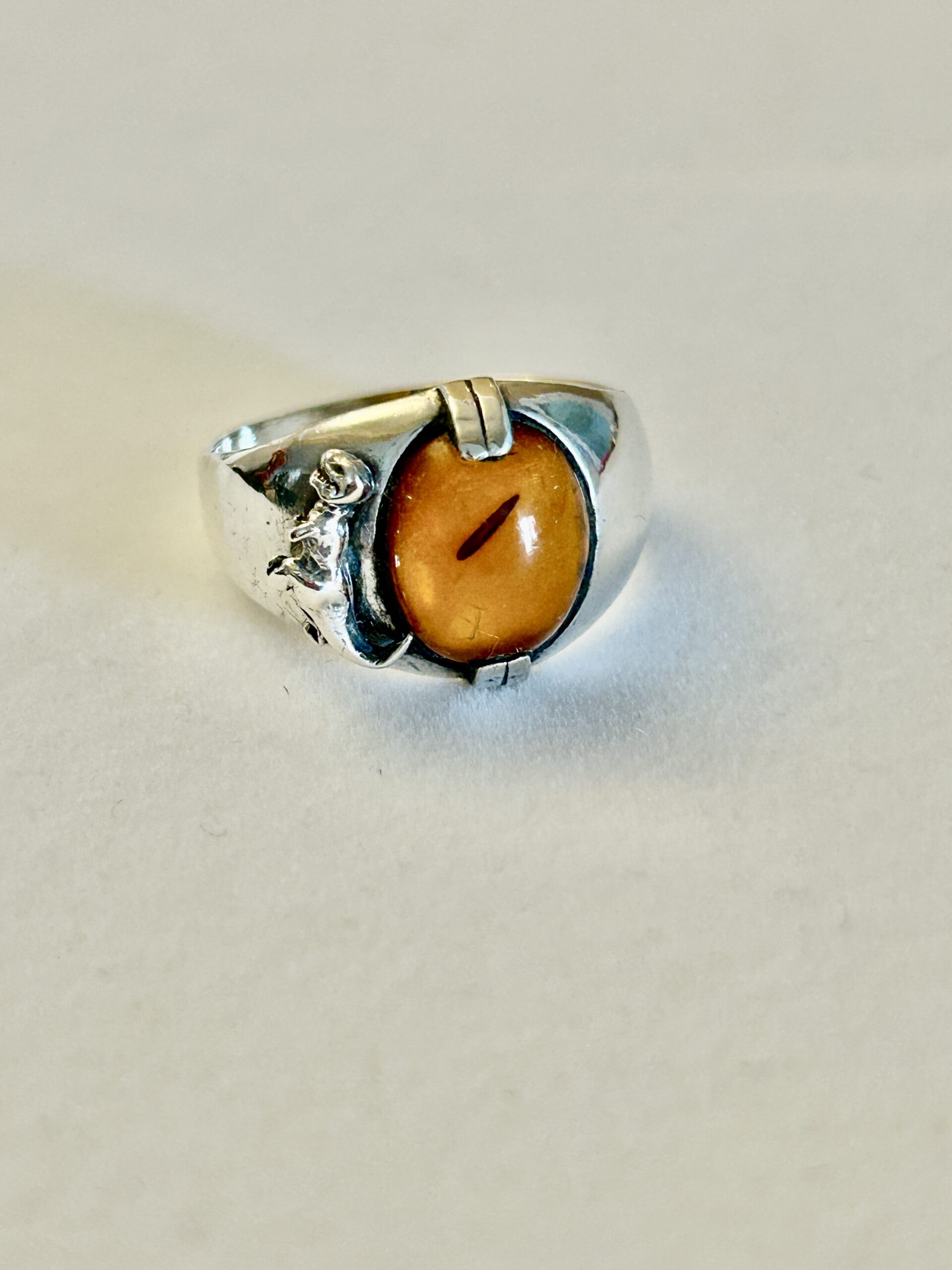 This sterling silver ring with Baltic amber is enhanced with a small dinosaur. The ring is approximately .50 x .50 inch across the top including Dino. Size 9.75 only in stock.