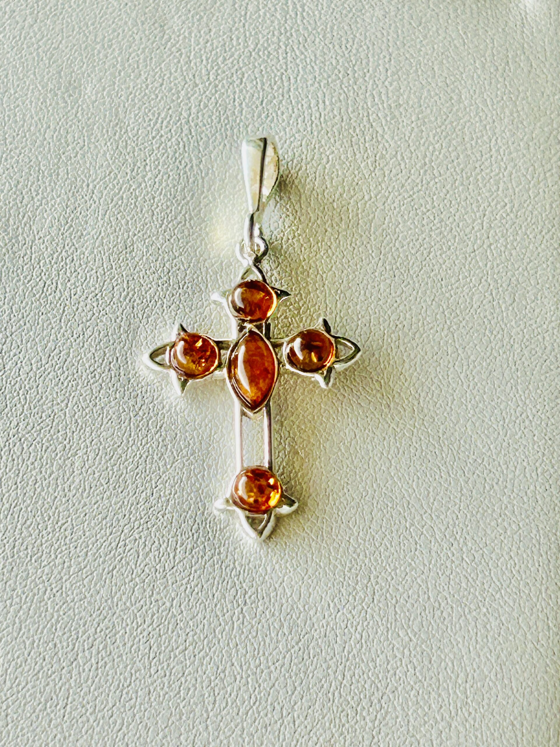 This sterling silver cross is set with five (5) Baltic ambers and is approximately 1.5 inches long.