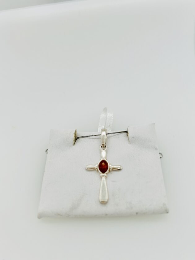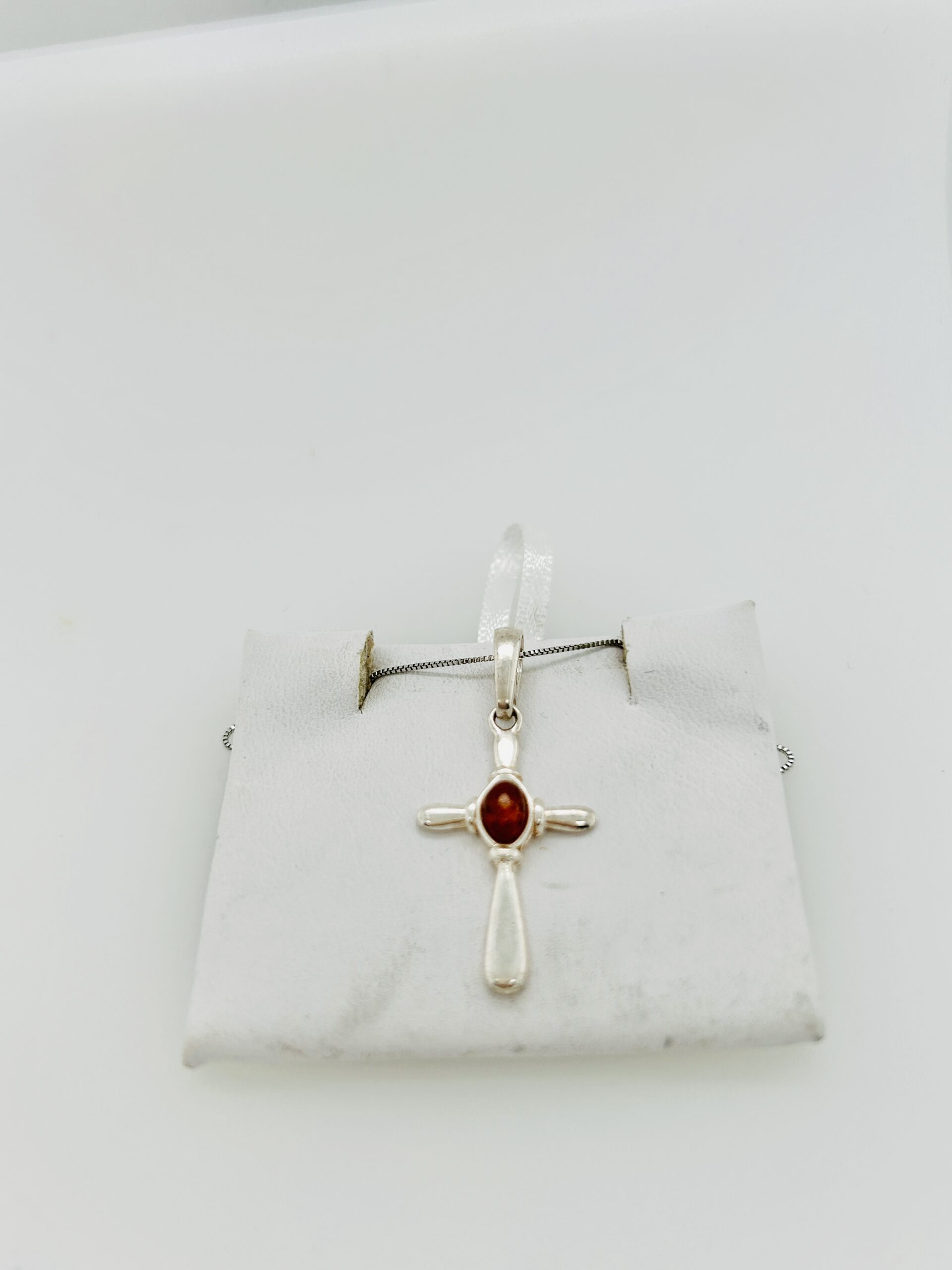 This sterling silver cross is set with a honey color oval amber, The cross pendant is approximately 1.5 inches including the bail and hangs from an eighteen (18) inch long sterling chain.