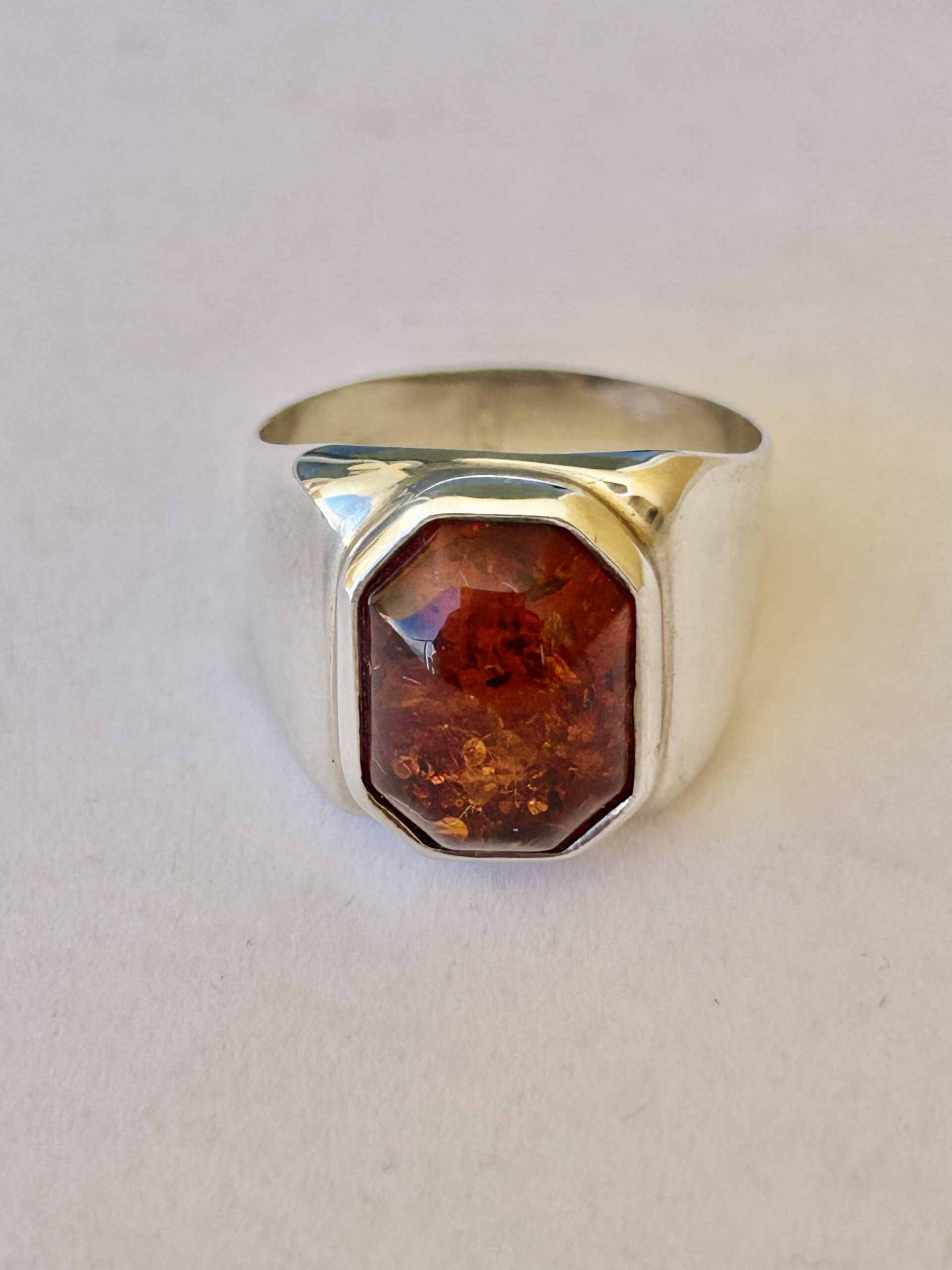 Sterling silver mans ring is approx. 18 X 14 mm at the top and is set with a reflective cognac color Baltic amber. Sizes 12.75 or slightly larger in stock. Please e mail for your preference.