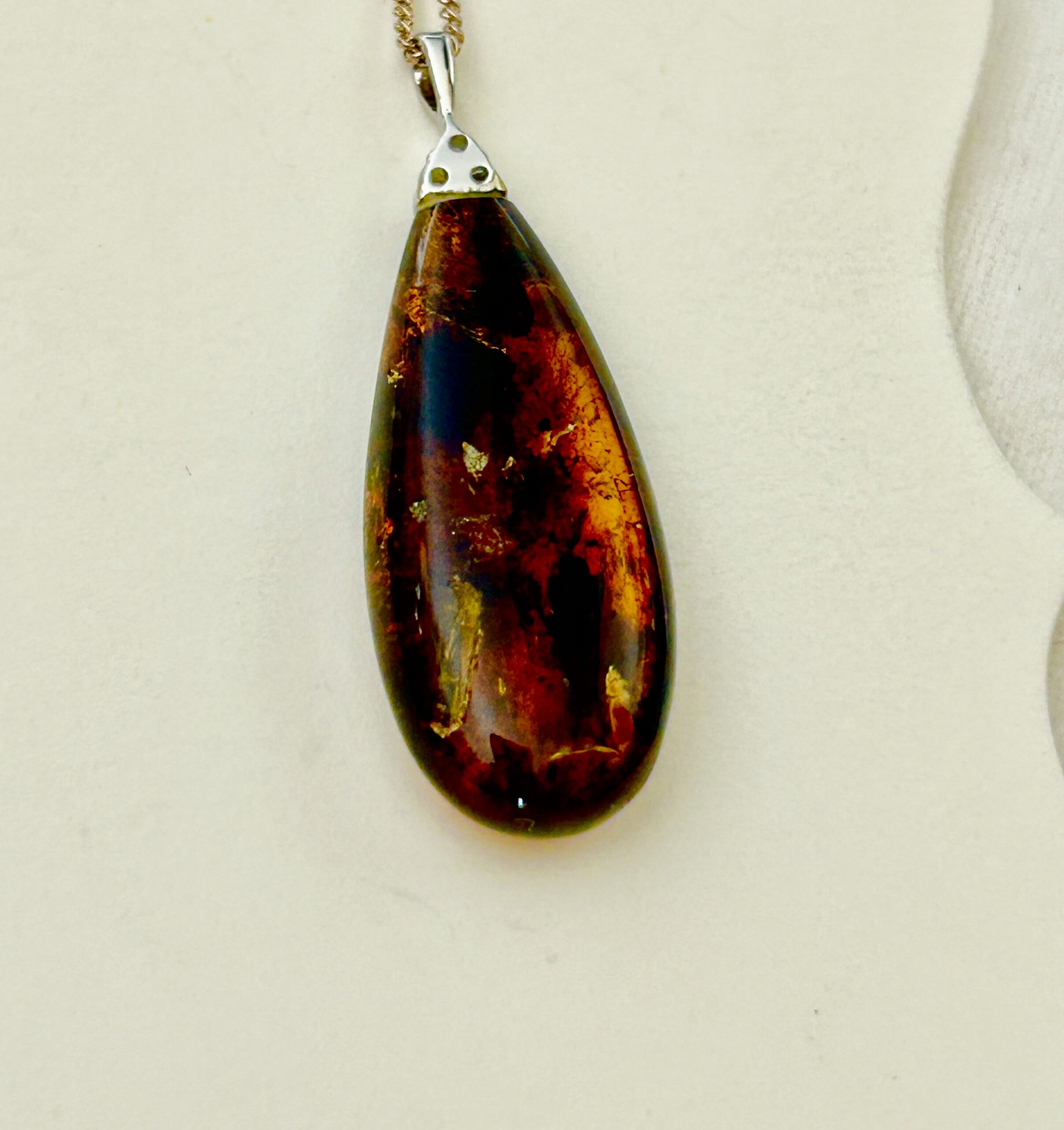 This genuine blue amber drop pendant is approximately 1.75 inches long. The color in natural daylight is deep cognac, but when exposed to a blue light, it shows blue contrary to other amber colors under the same light. Amber that is blue in daylight is usually color enhanced artificially.
