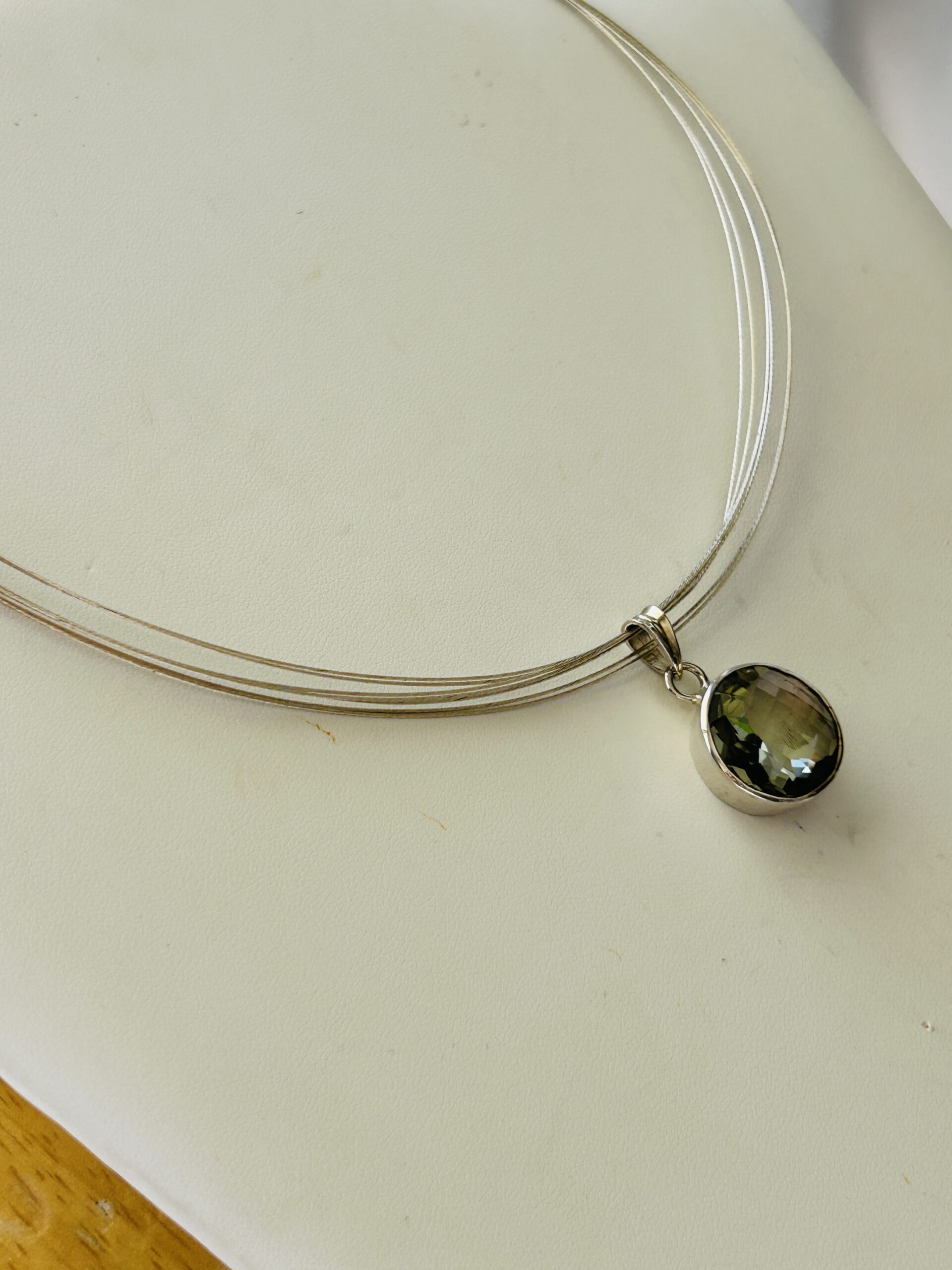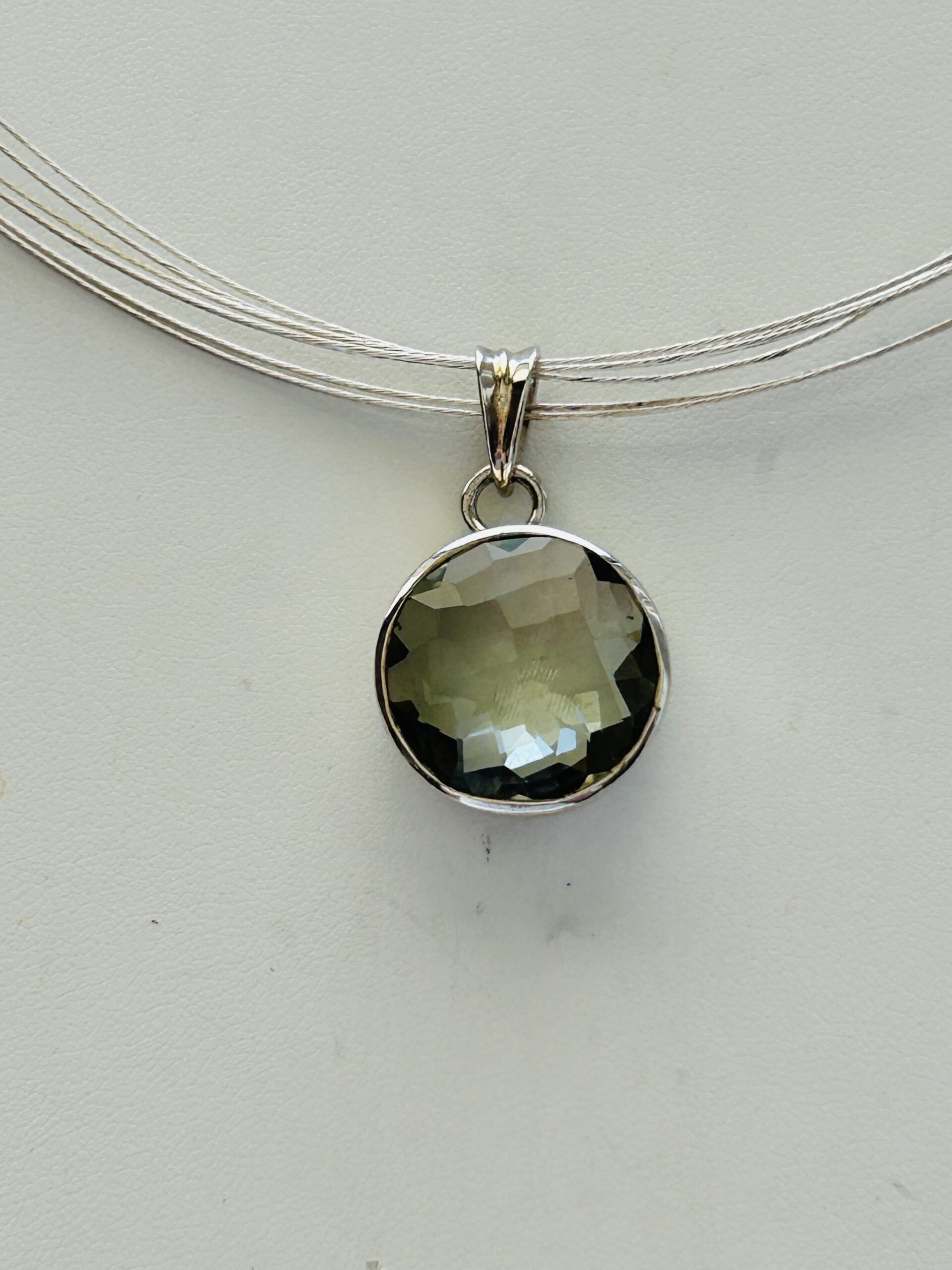 This sterling silver pendant is set with a very lite green genuine Tourmaline stone that is approximately 17mm in diameter. The pendant comes with a slightly adjustable length chain (16-20 inches).