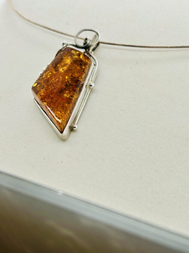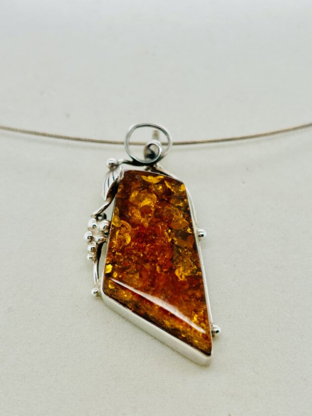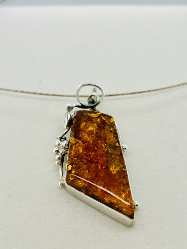 This beautiful asymmetrical Baltic amber pendant is framed by a grapevine sterling silver design that is approximately 2.5 inches long. The pendant hangs from a sterling silver omega chain that is eighteen (18) inches long .