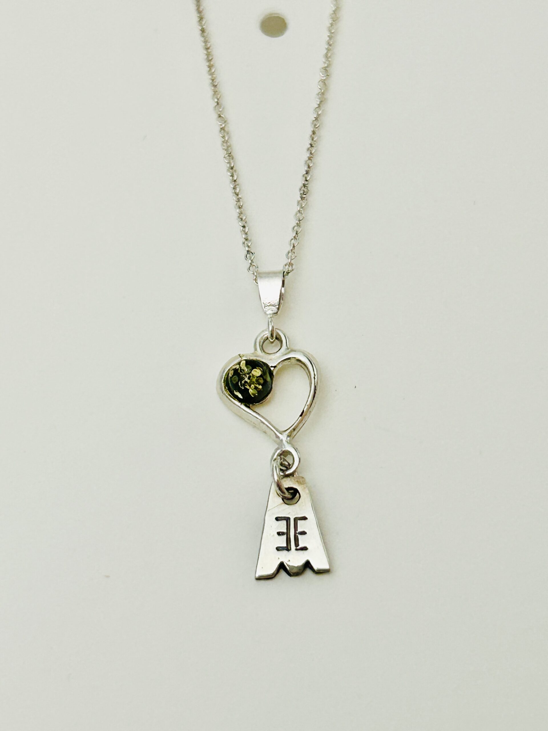 This small sterling silver heart is set with a green Baltic amber bead . The pendant is approximately 1.25 inches long including the Baltic charm and bail.