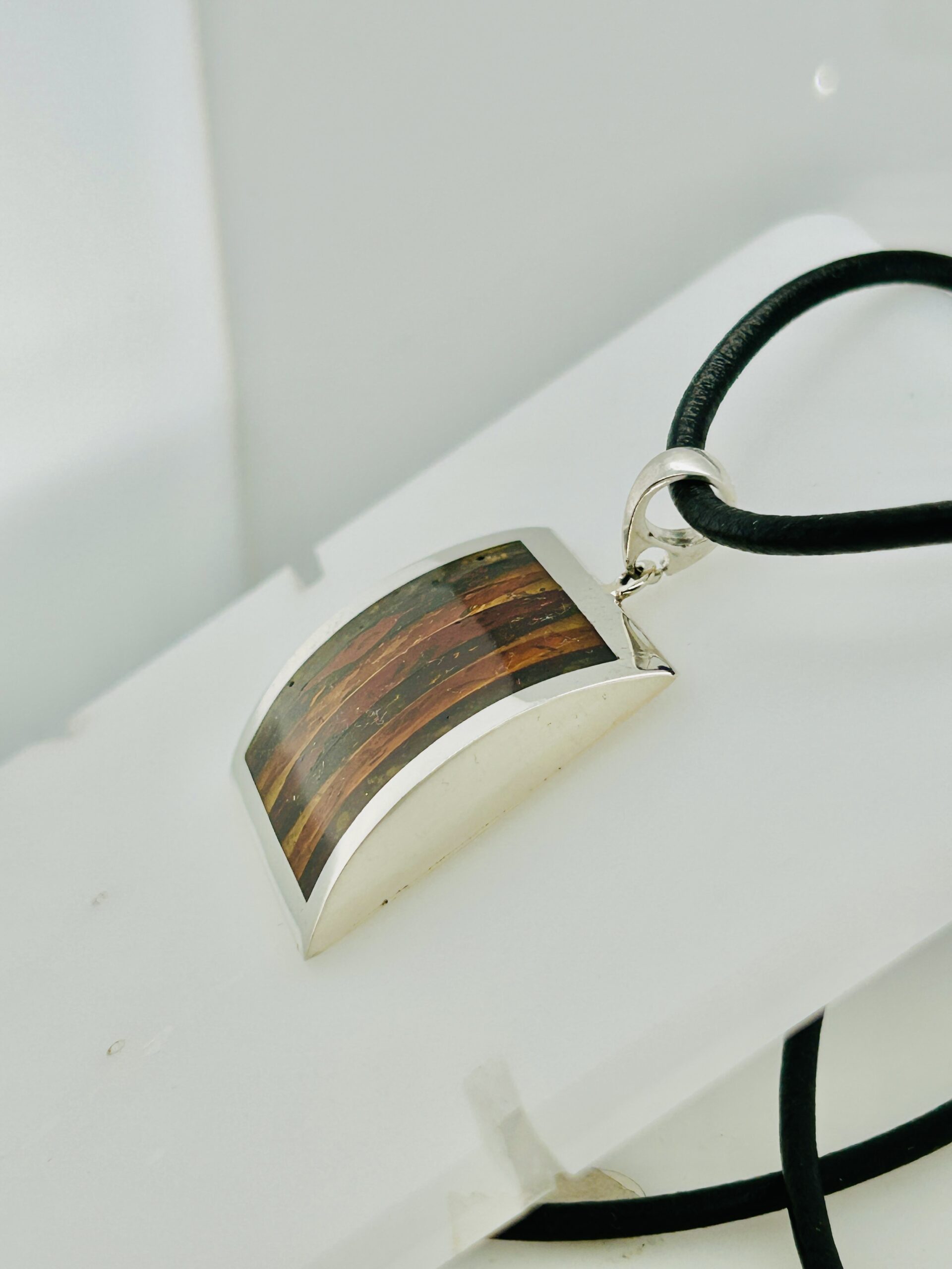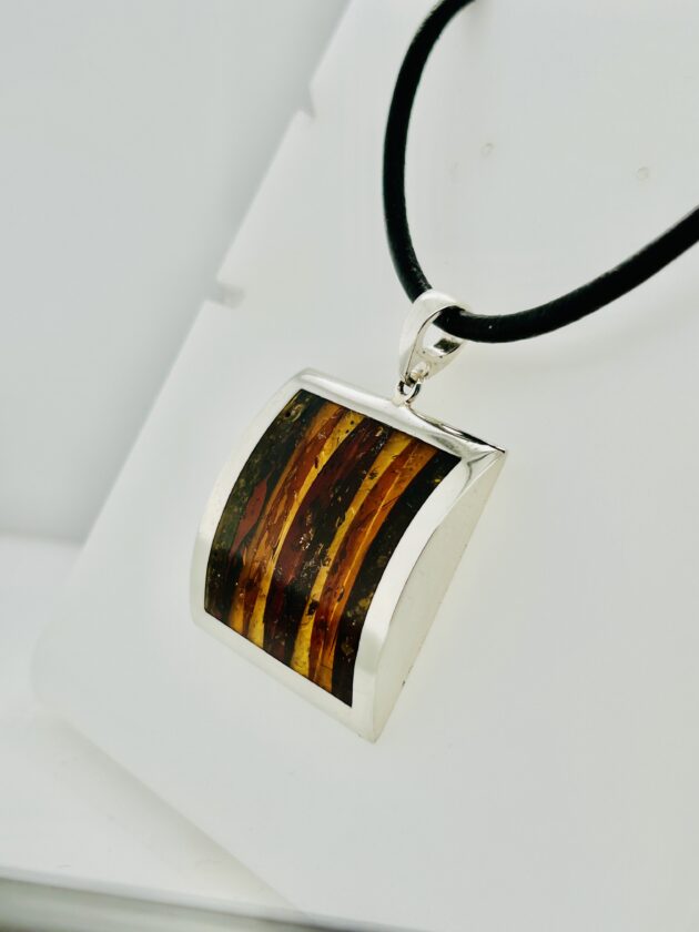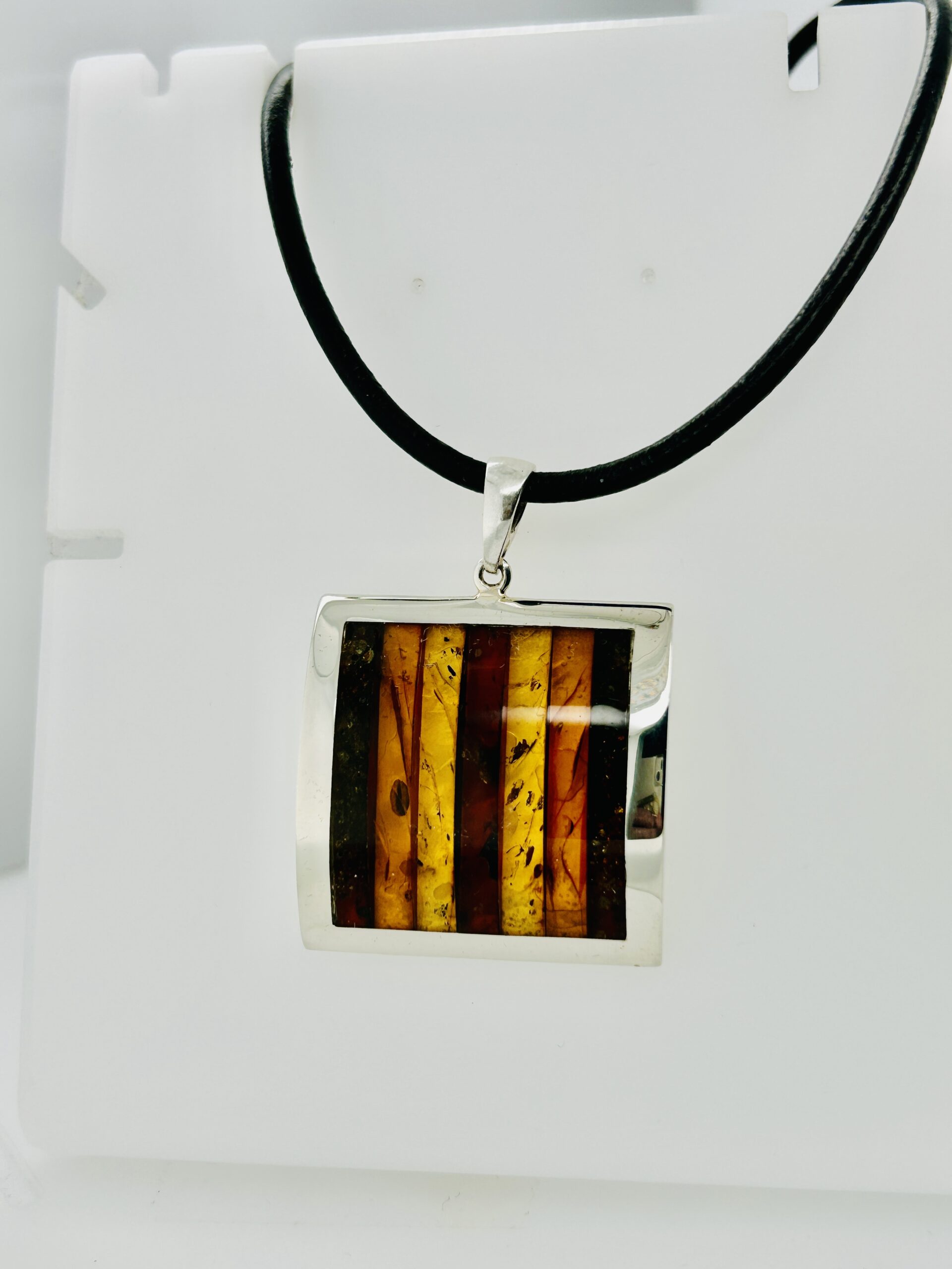 This smooth unisex inlayed Baltic amber pendant is set into a domed sterling silver high polished frame. The pendant is strung onto a 24.5 inch longĀ black leather cord.
