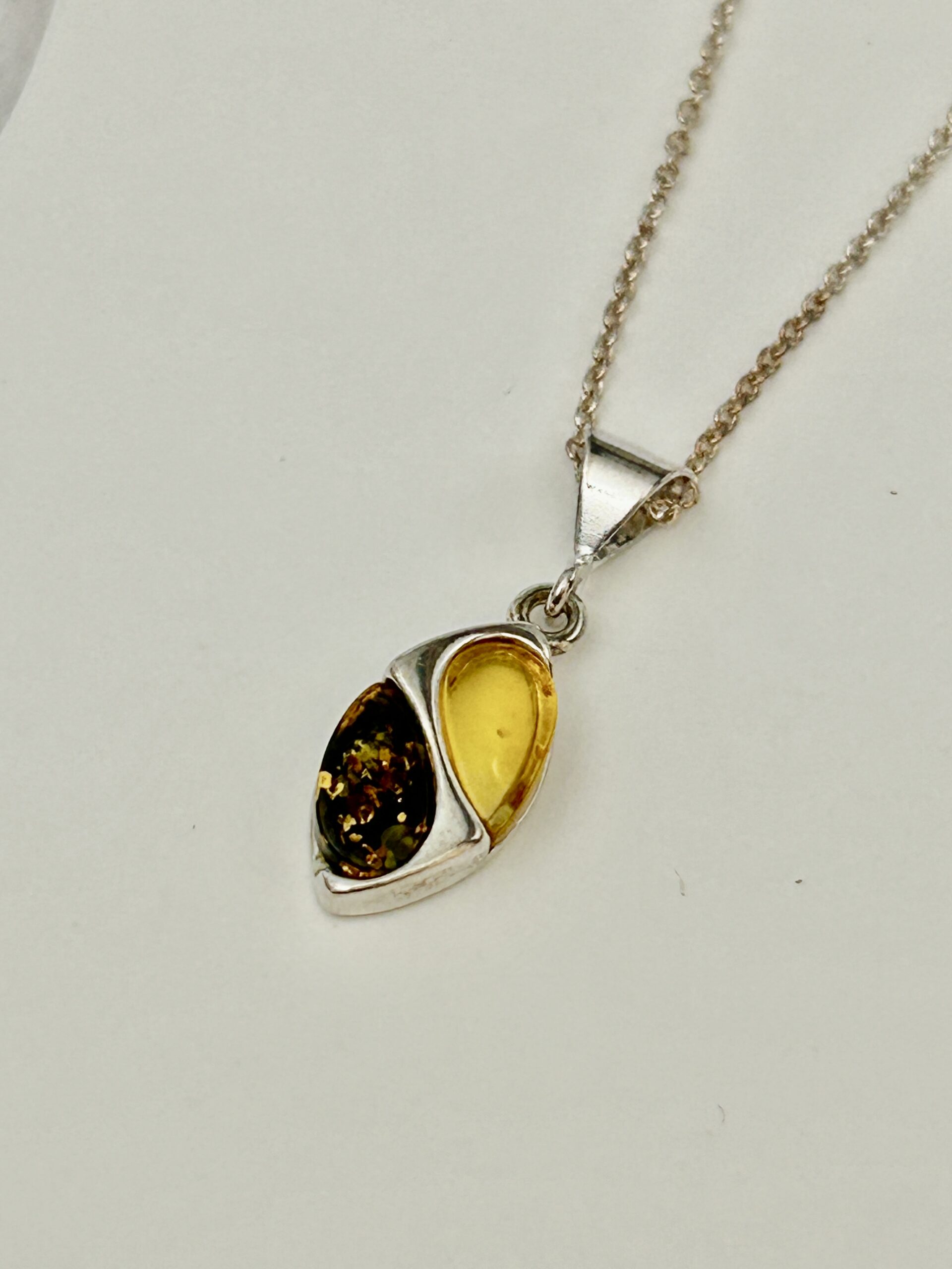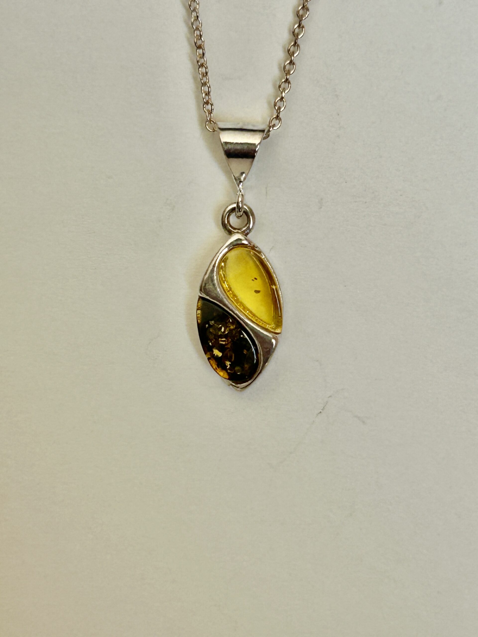 Two (2) Baltic ambers integrated into a beautiful sterling silver pendant. The ornament is approximately .75 inches long excluding the bail.