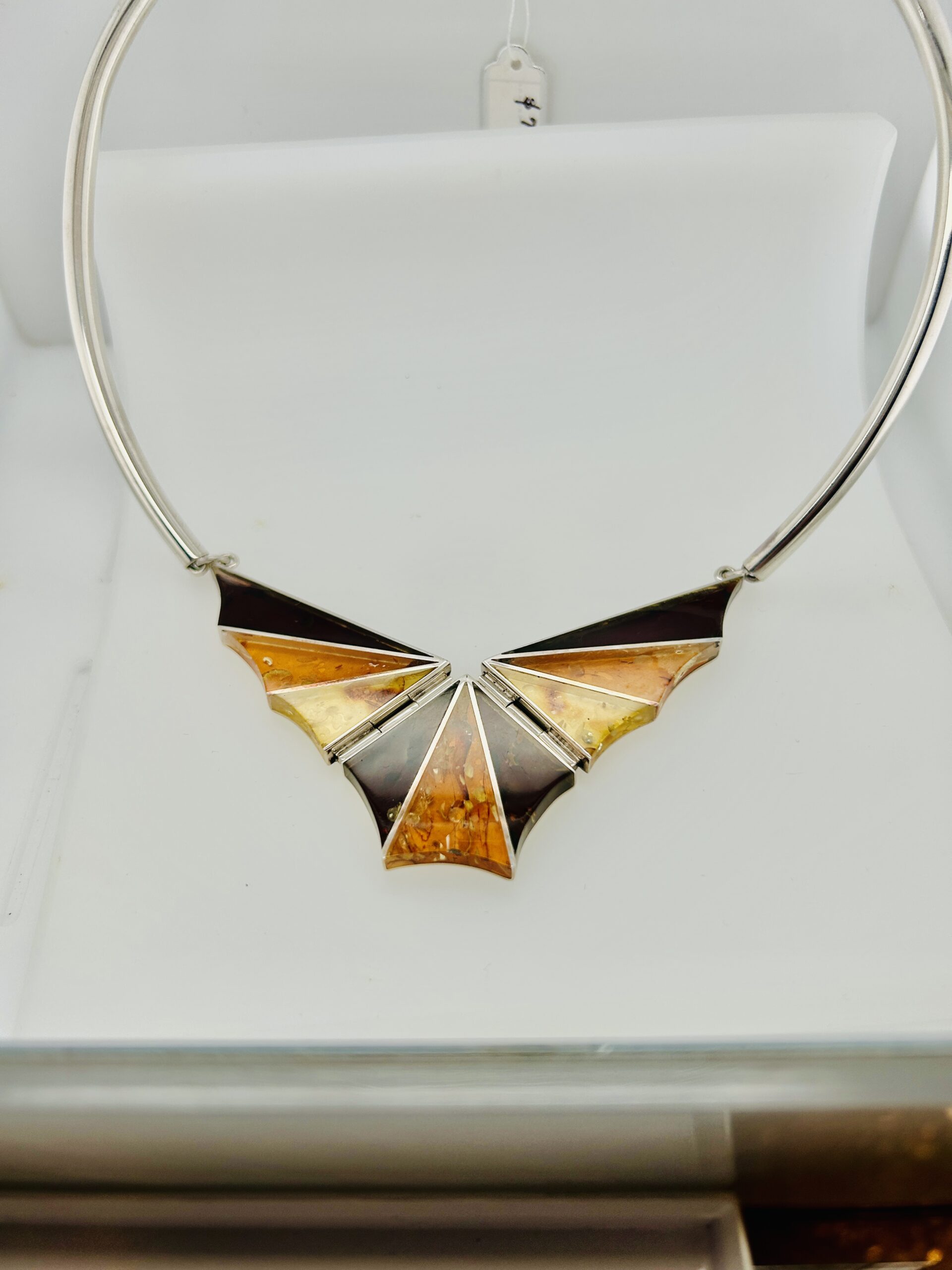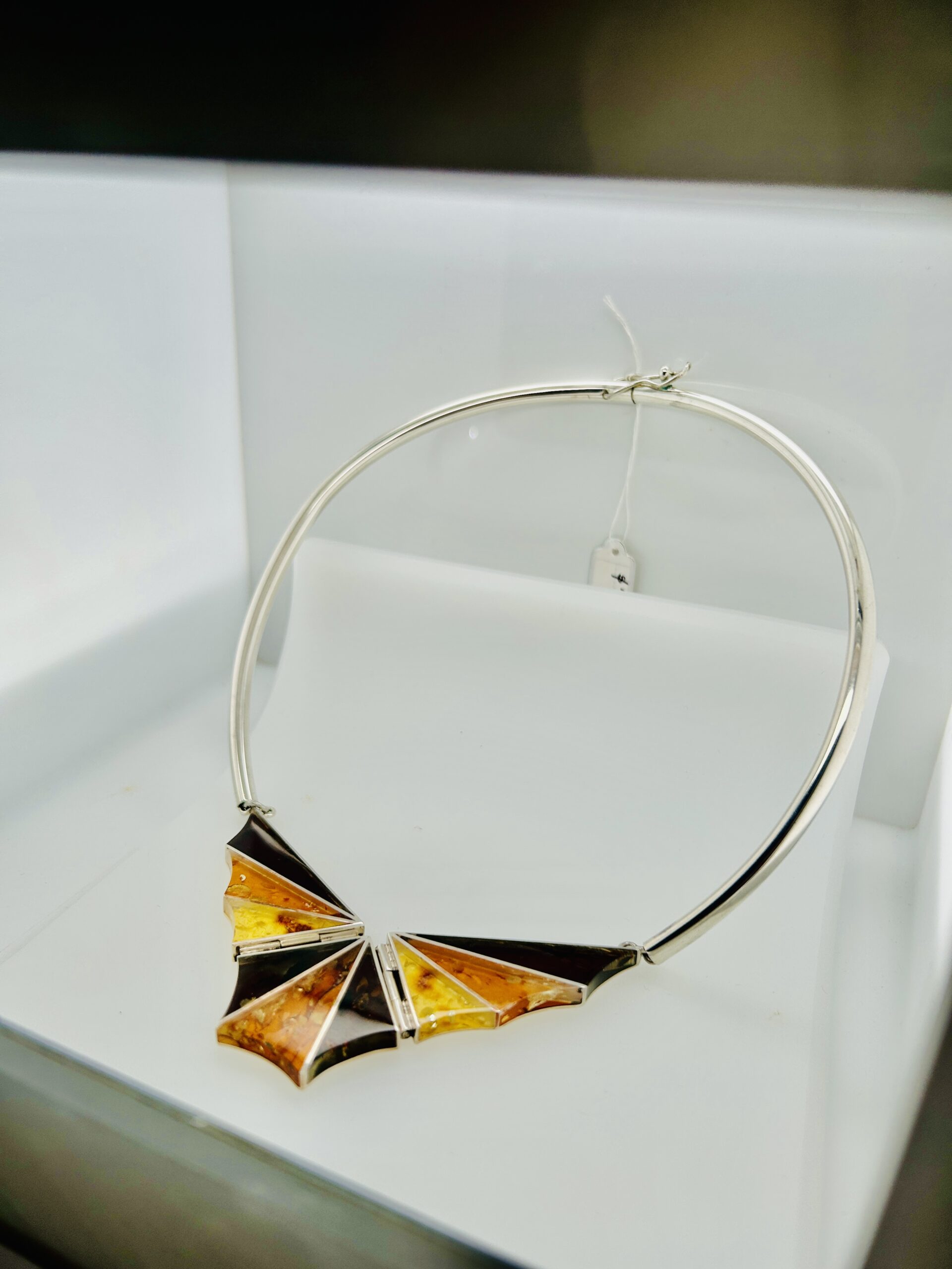 This sterling silver art piece has nine (9) Baltic ambers that are gold, cognac and honey in color. The necklace is approximately 17 – 17.5 inches long and has a safety latch closure. Unusual art piece.