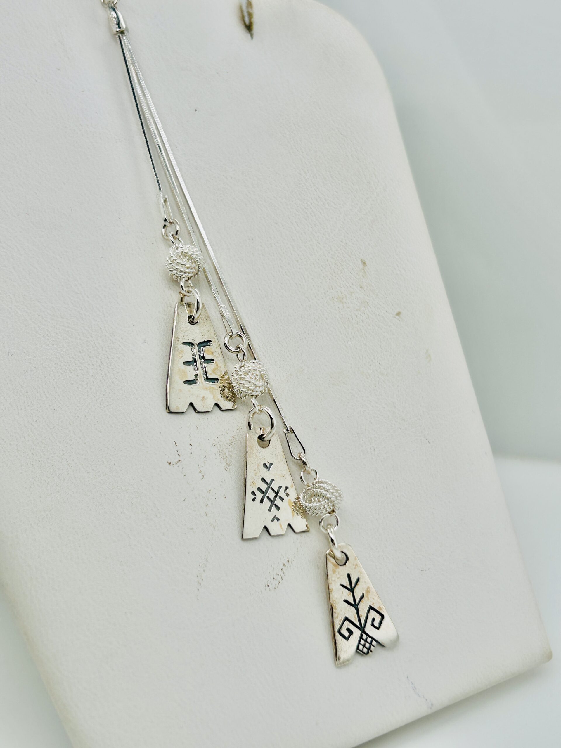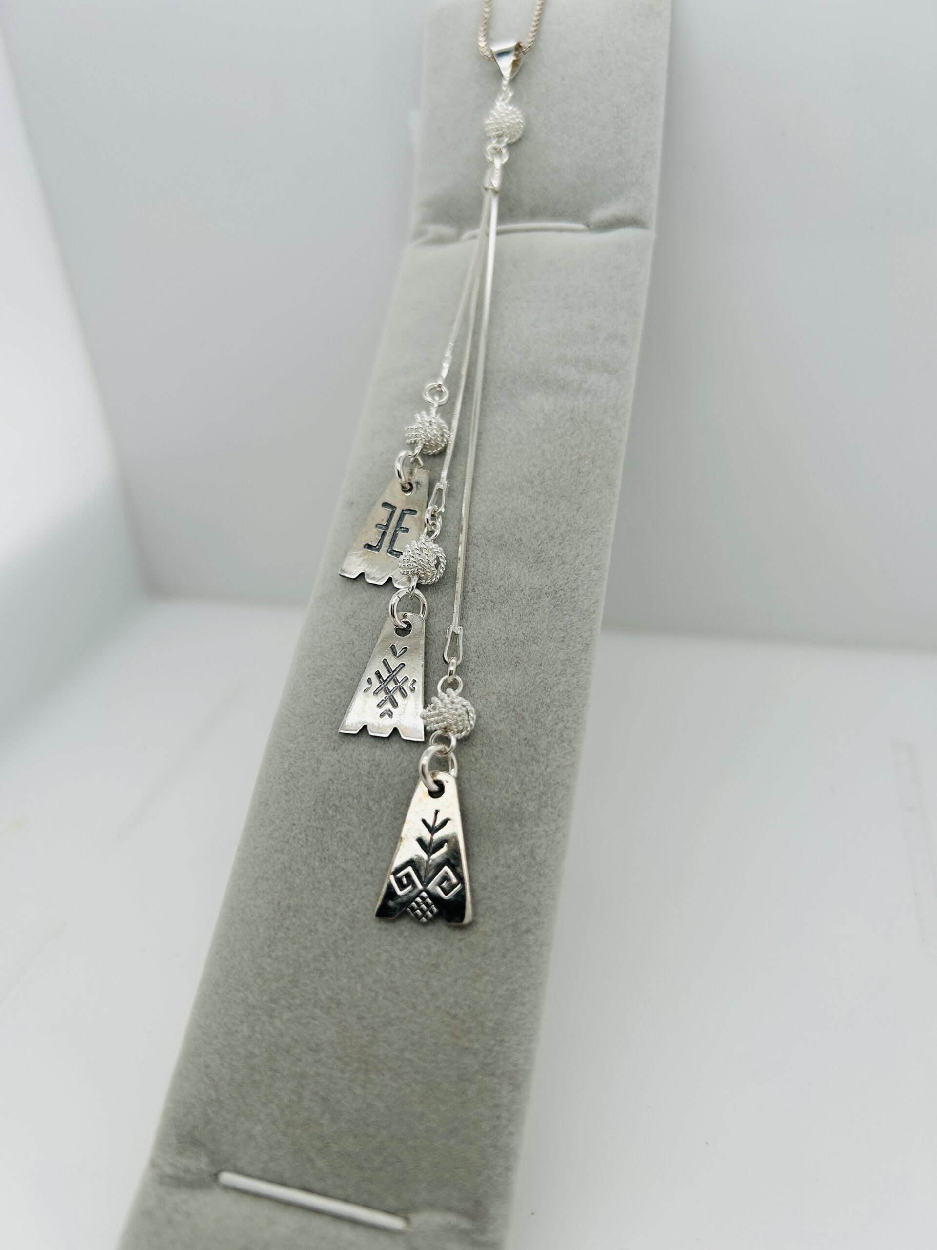 This striking sterling silver twisted knot design has three (3) flowing silver chains that hold three large Baltic design charms. The pendant is approximately five (5) inches long from the bail to the bottom of the charm. An eighteen (18) inch chain is included.