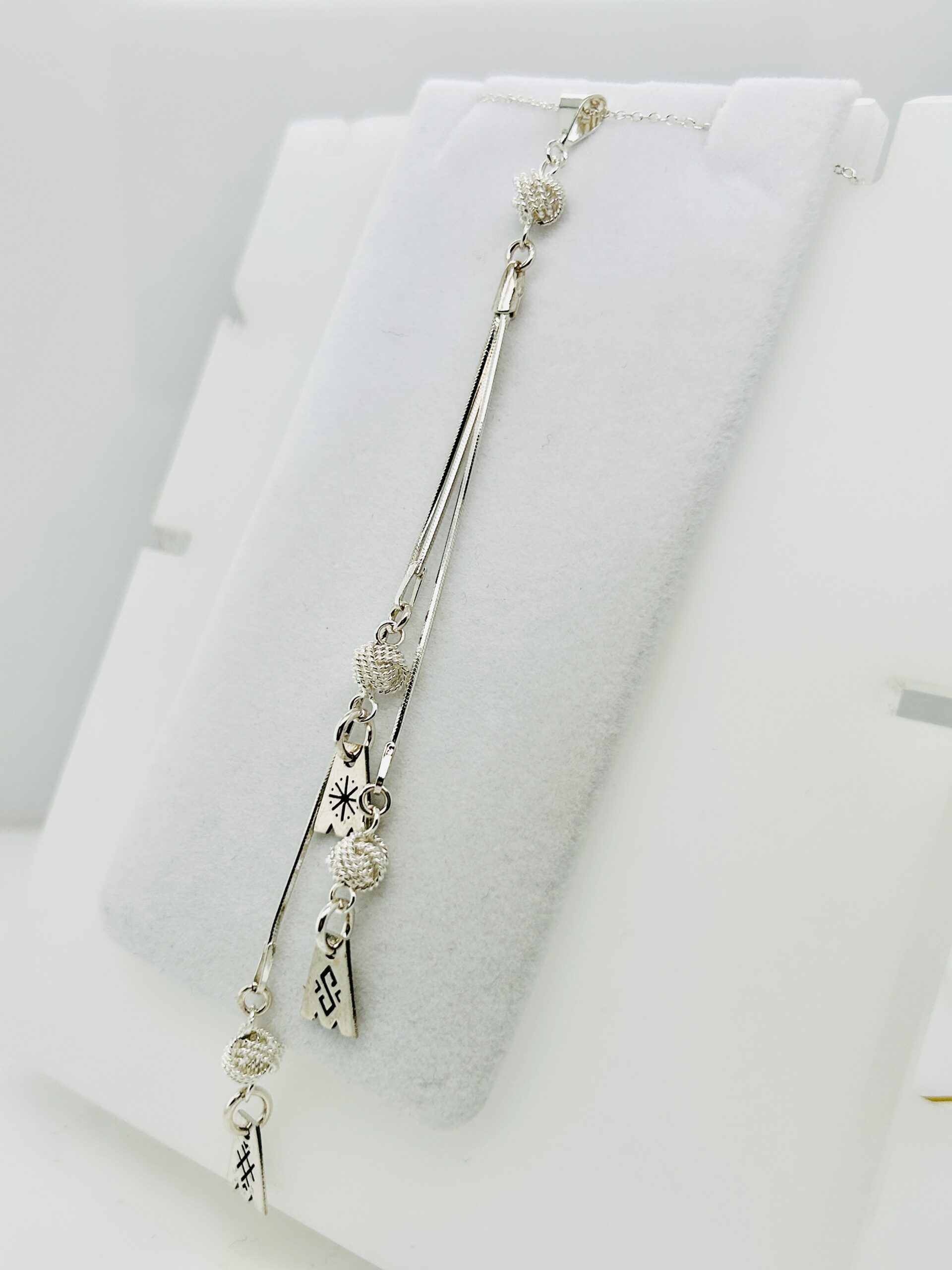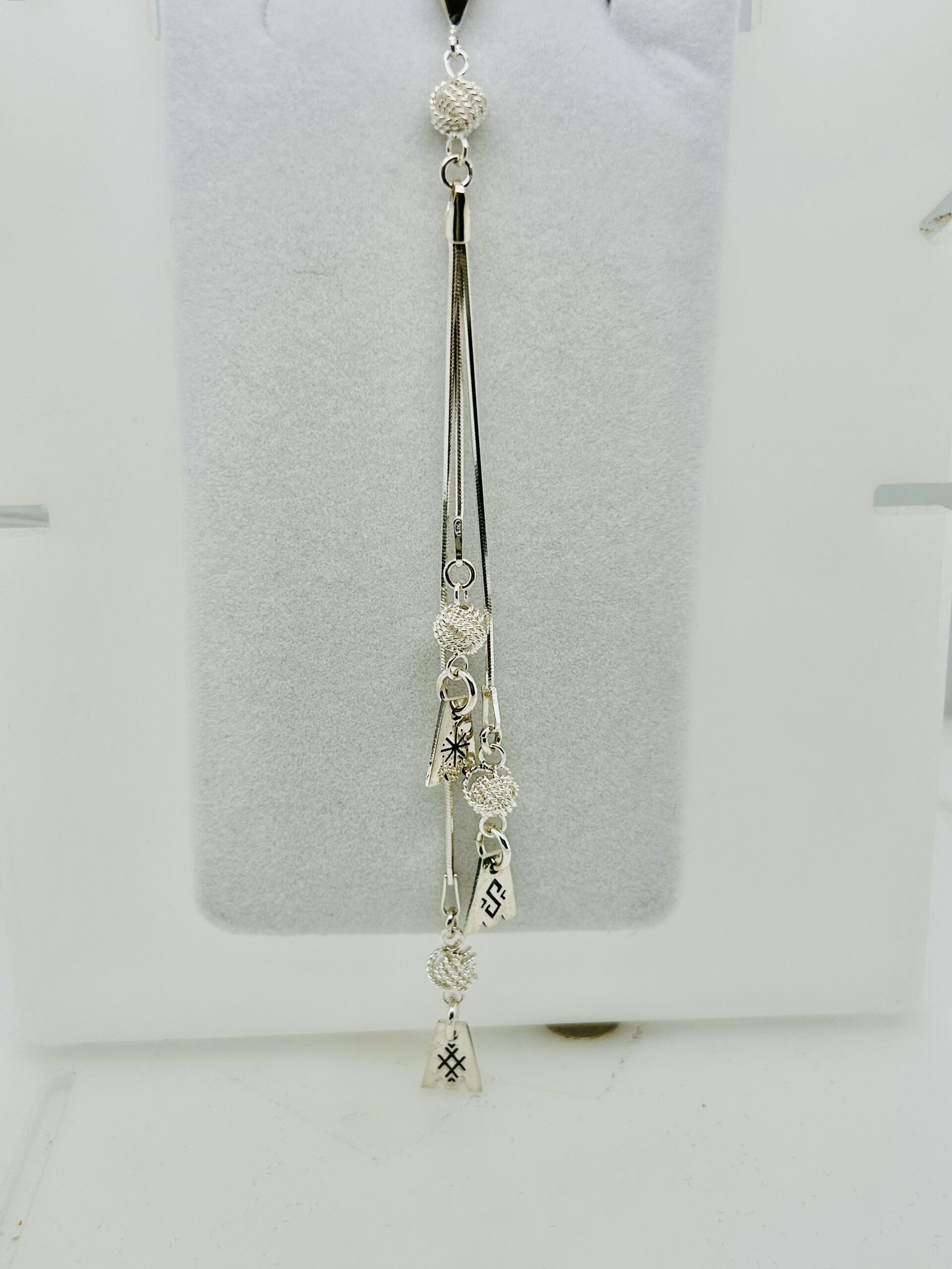 This sterling silver pendant has twist wire knots with three (3) cascading chains with Baltic charms. The pendant is approximately 4.75 inches long and comes with an eighteen (18) inch chain.