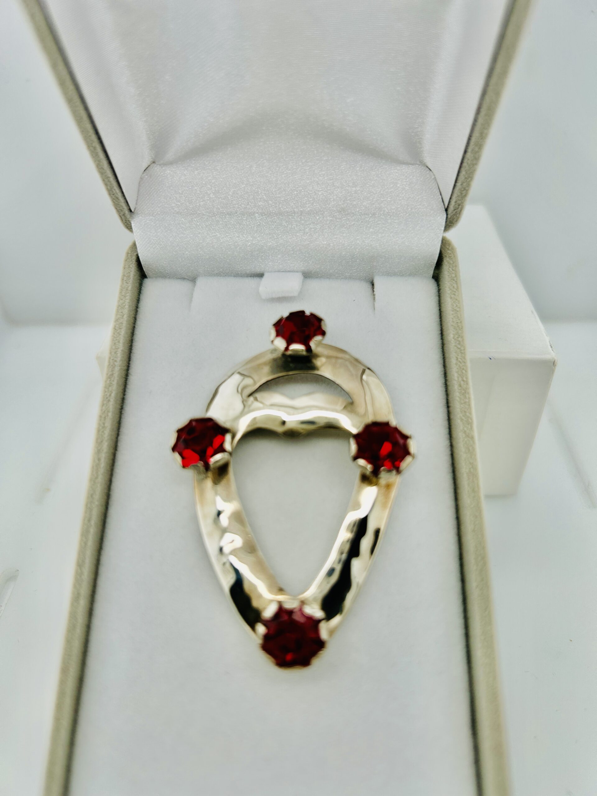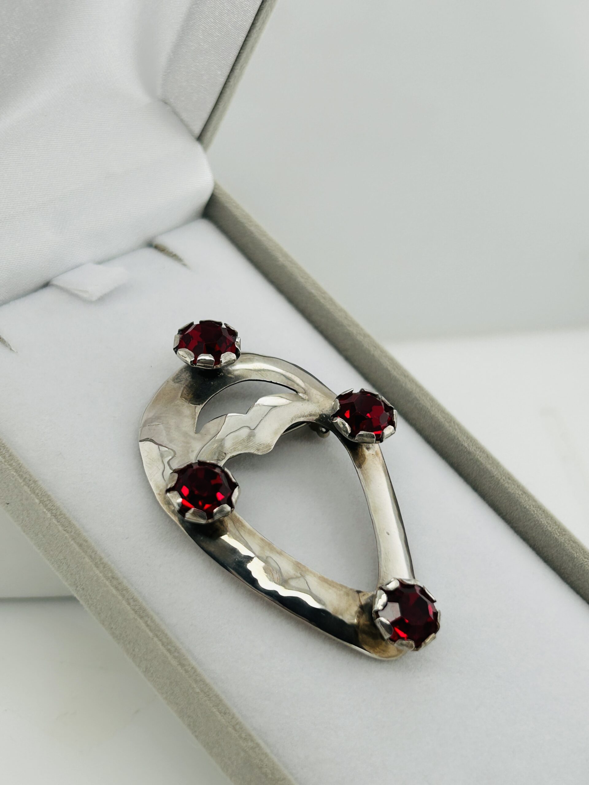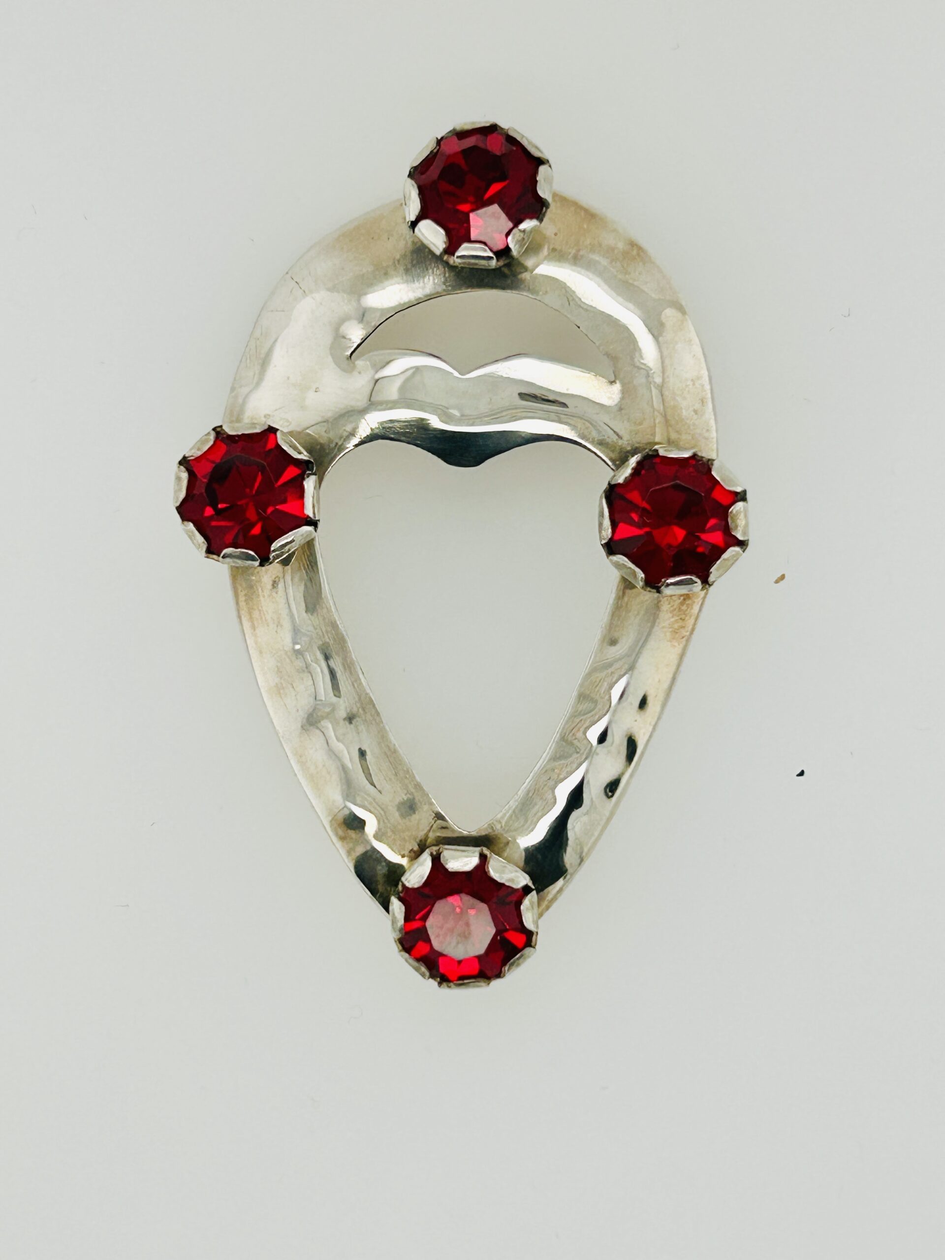 This sterling silver historical design pin is set with four (4) red crystal stones and is approximately, 37mm wide. The pin has a unique pierced heart shape cutout.