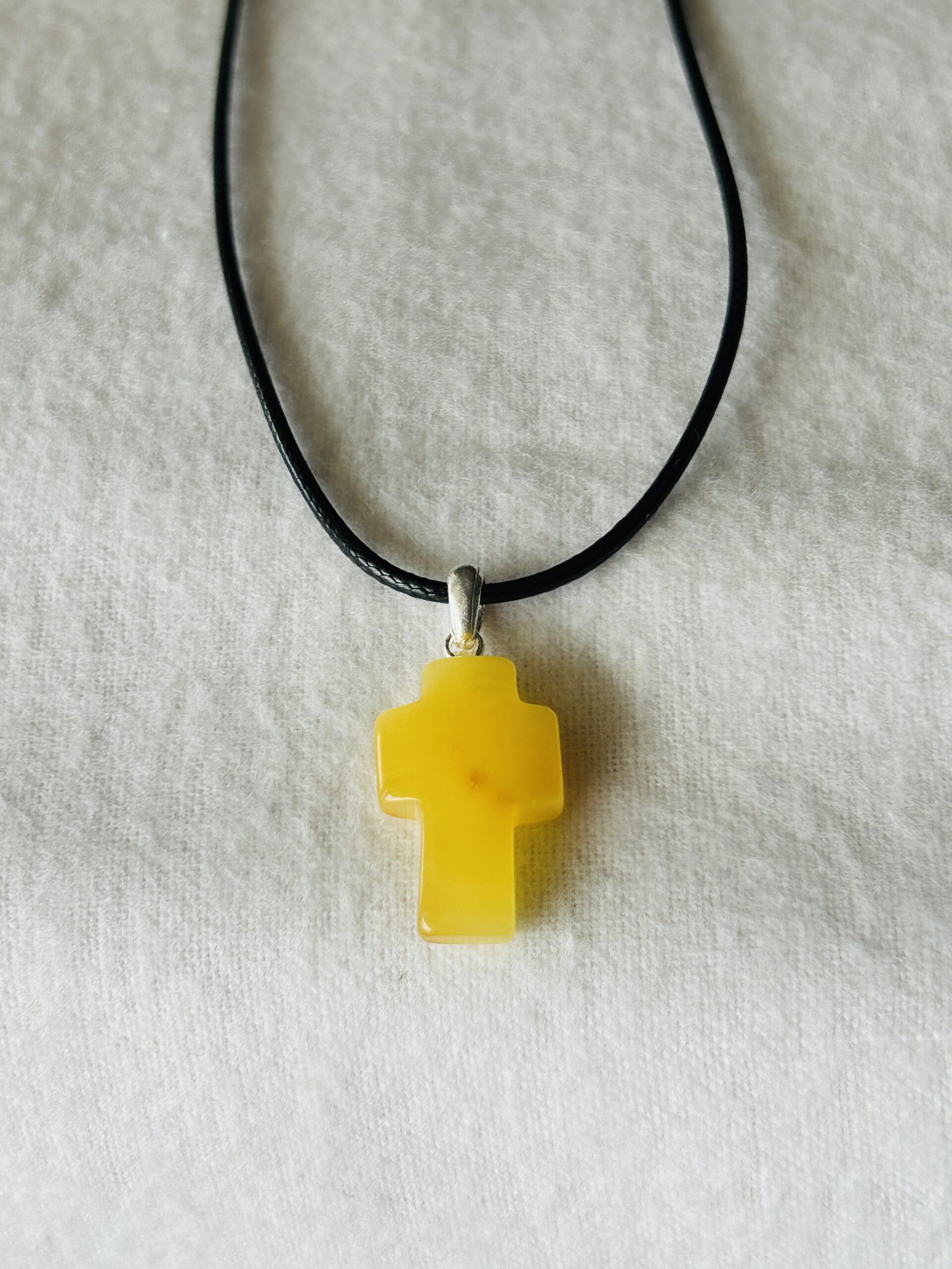 This lemon yellow Baltic Amber cross is approximately 1.25 inches long including the sterling silver bail. The pendant hangs from a black adjustable cord that measure 18 – 20 inches.