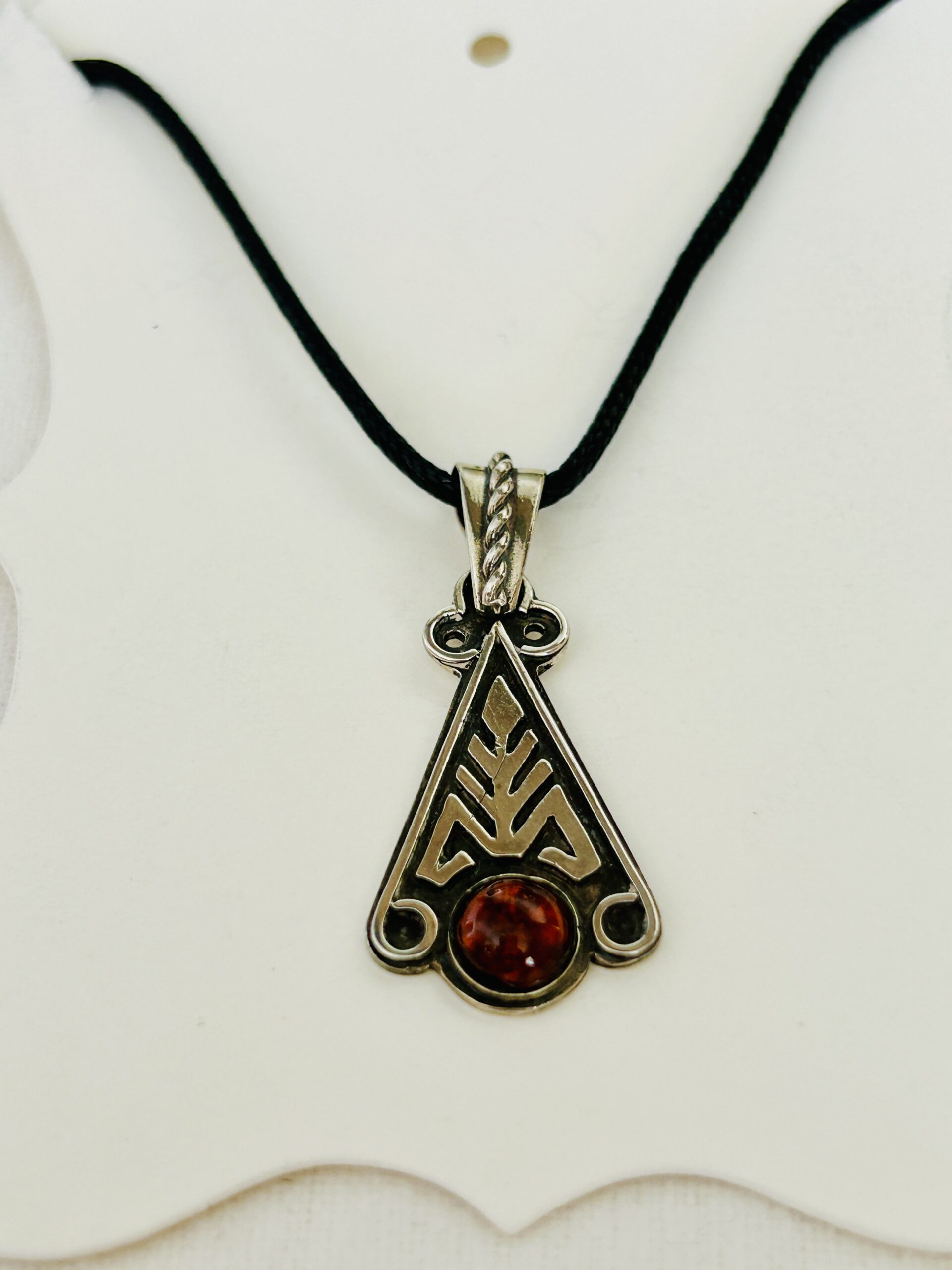 This sterling silver pendant is set with a cognac/honey color amber and hangs from a black cord that is adjustable to length. The pendant is approximately 1.50 inches long including the bail.