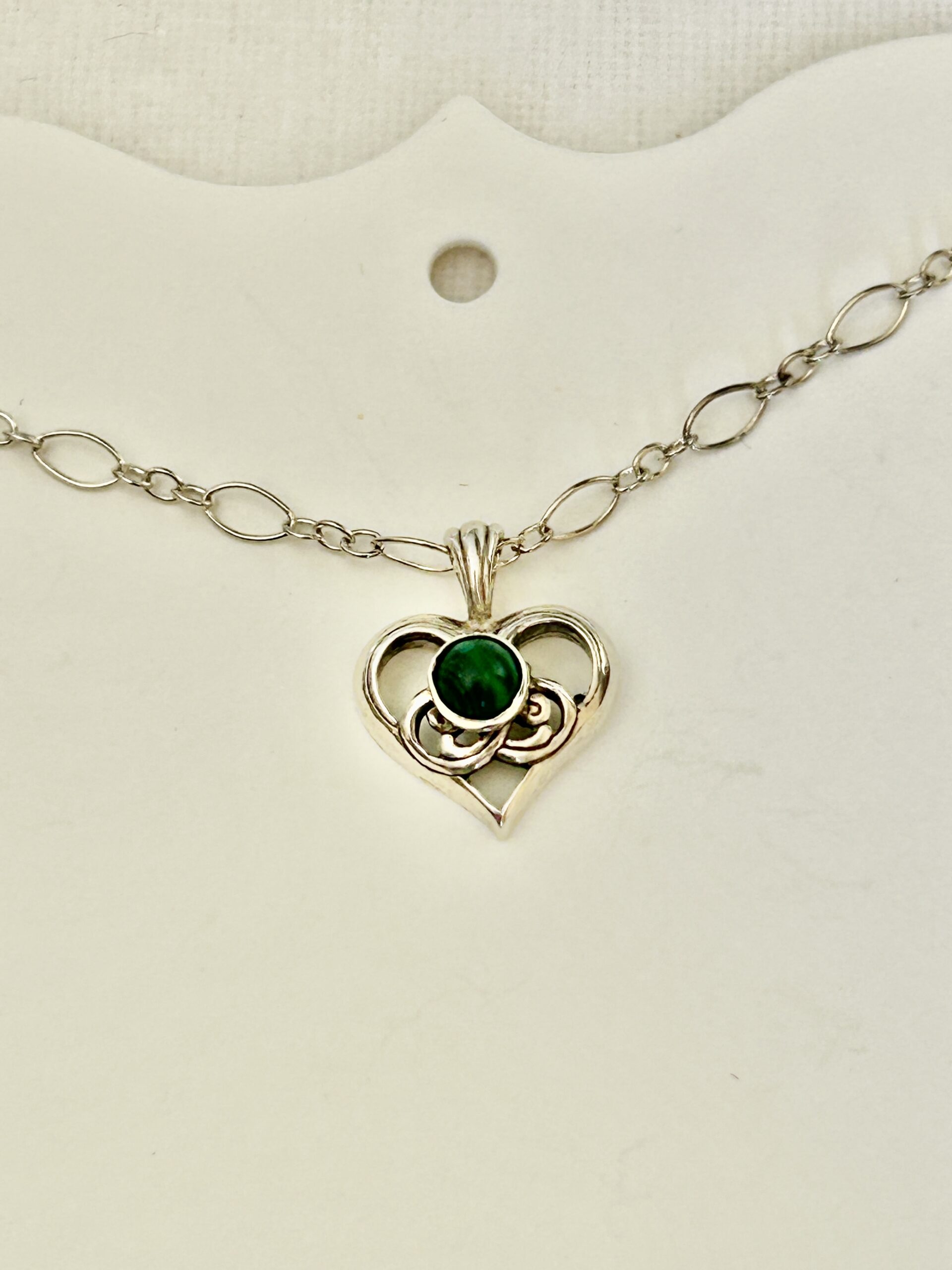 This cute sterling silver heart is set with a small genuine green malachite stone. The pendant is approximately .50 inches long including the bail and comes with an eighteen inch long chain