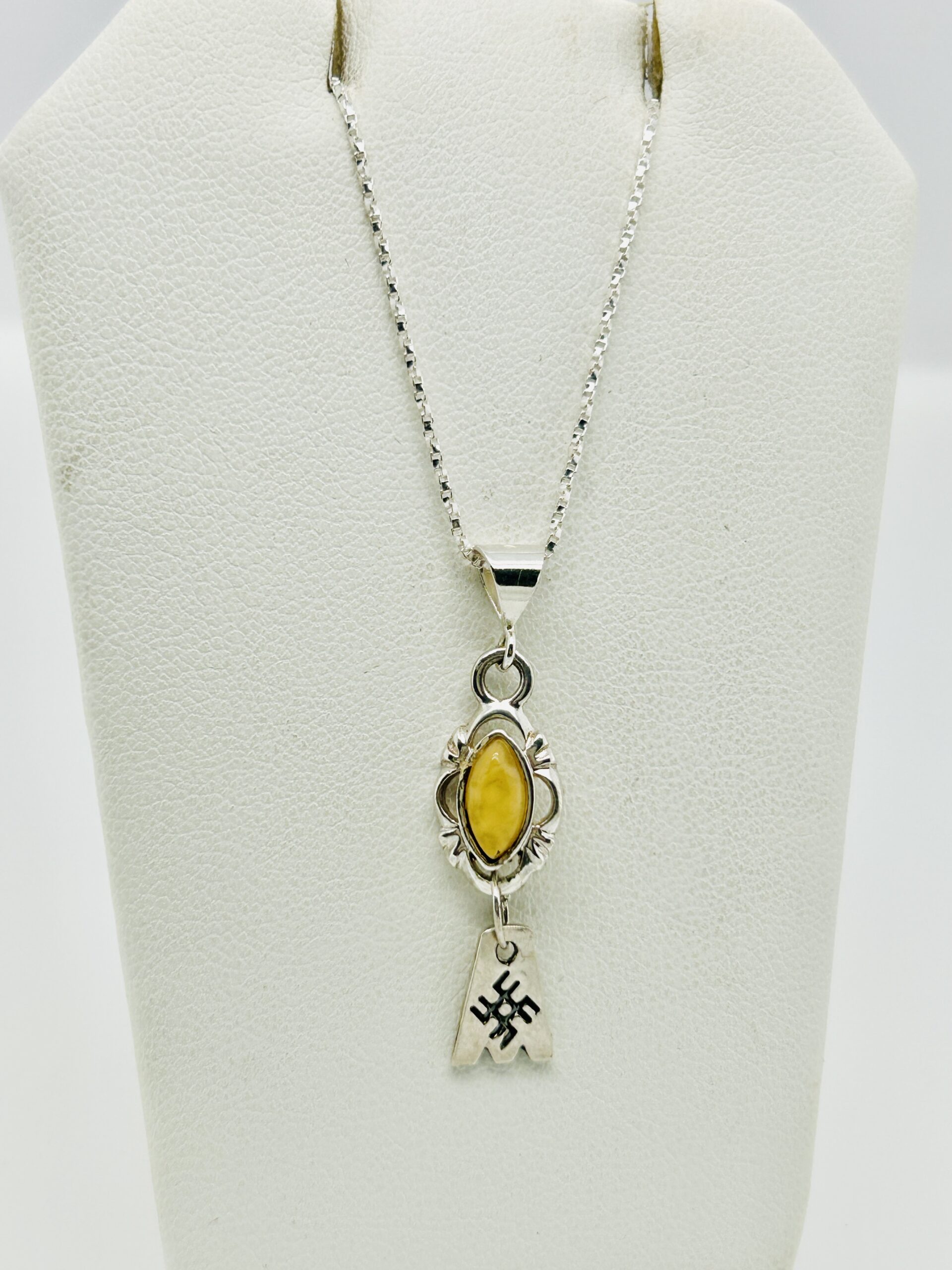 The small sterling silver pendant is set with a marquise cut Baltic amber. The pendant is approximately 1.5 inches long and comes with an eighteen (18) inch long chain.