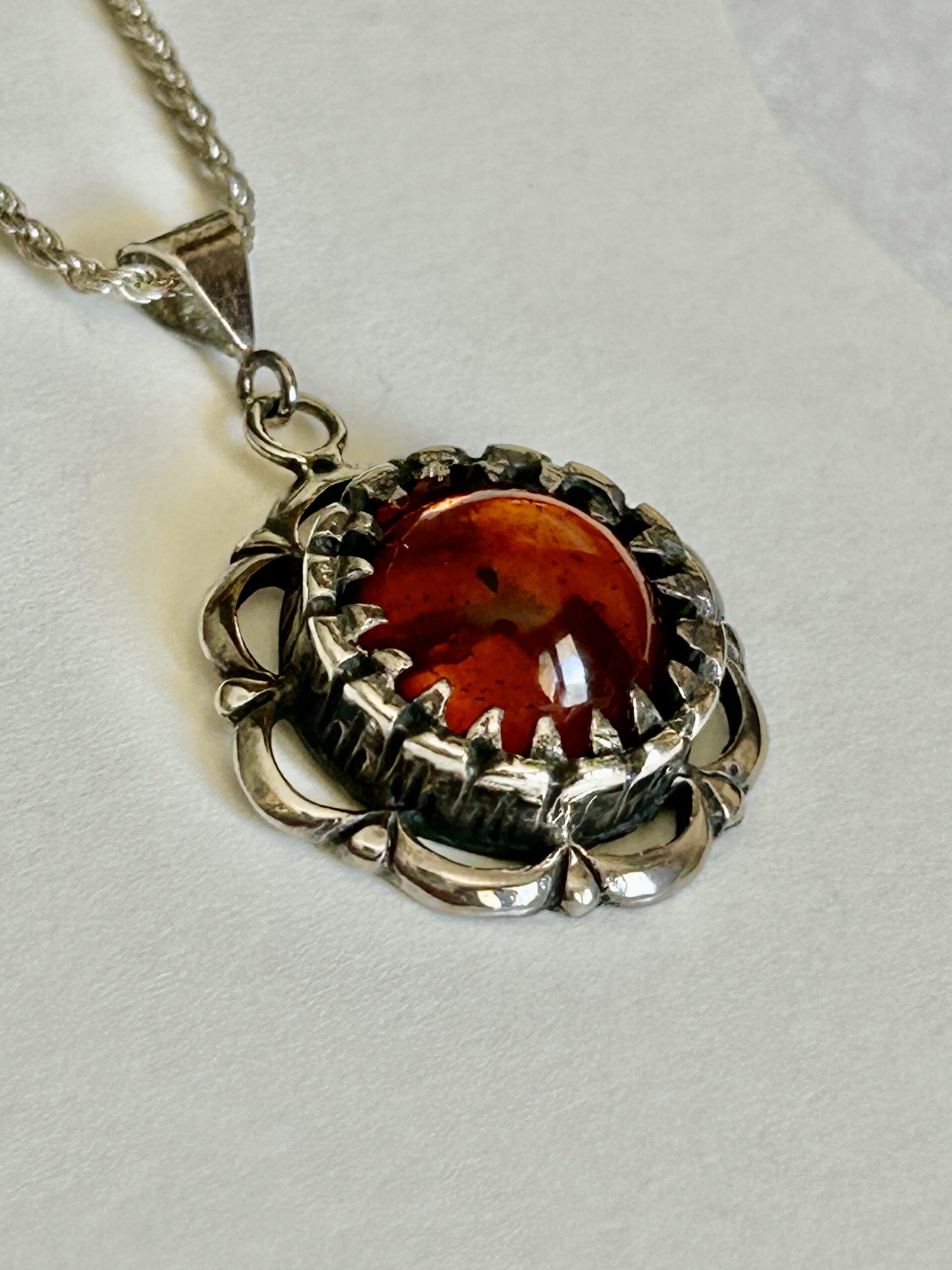 This medium- large Moon design pendant is approximately 2 cm in diameter and is set with a beautiful cognac color Baltic amber.