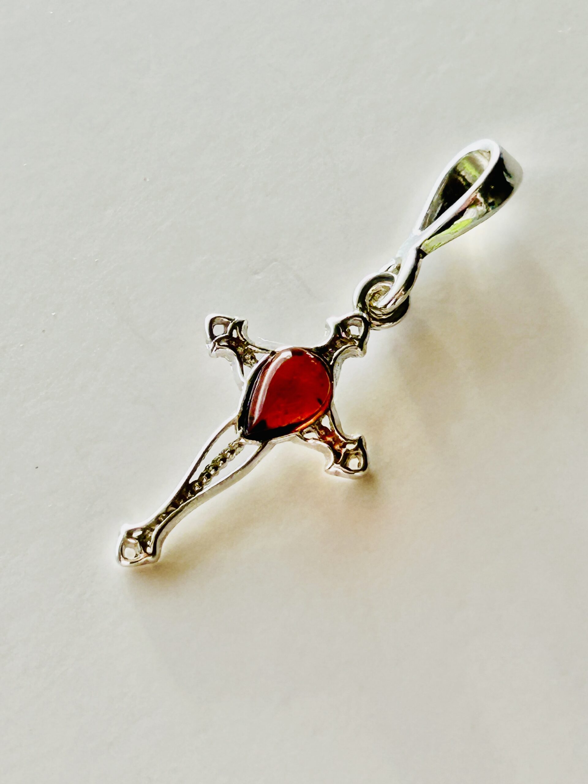 This small sterling silver cross is approximately 1.25 inches long including the bail. The cross iks set with a cognac color pear shaped amber and comes with an eighteen inch long chain.