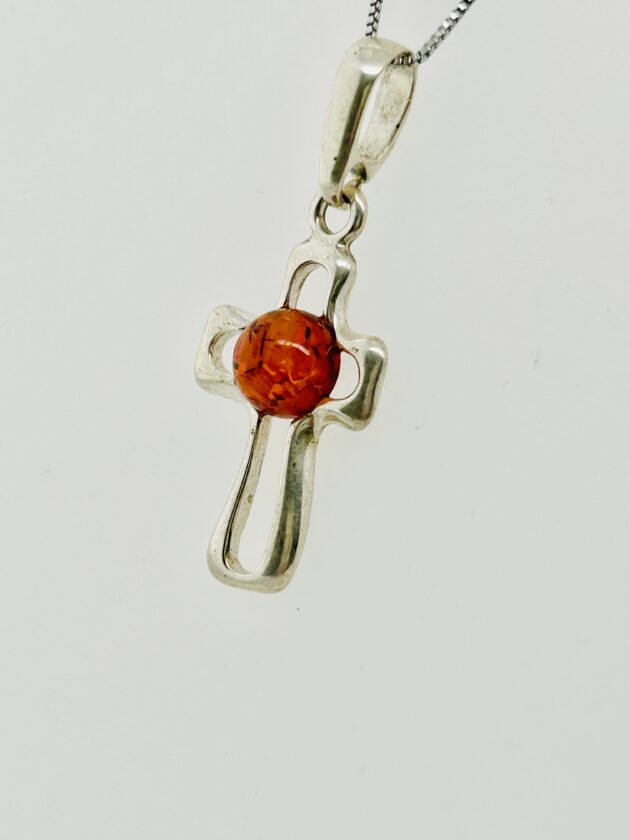 This round Baltic amber is set on a sterling silver cross that measures approximately 1.25 inches including the bail. The cross pendant hangs from a sterling silver eighteen (18) inch chain.