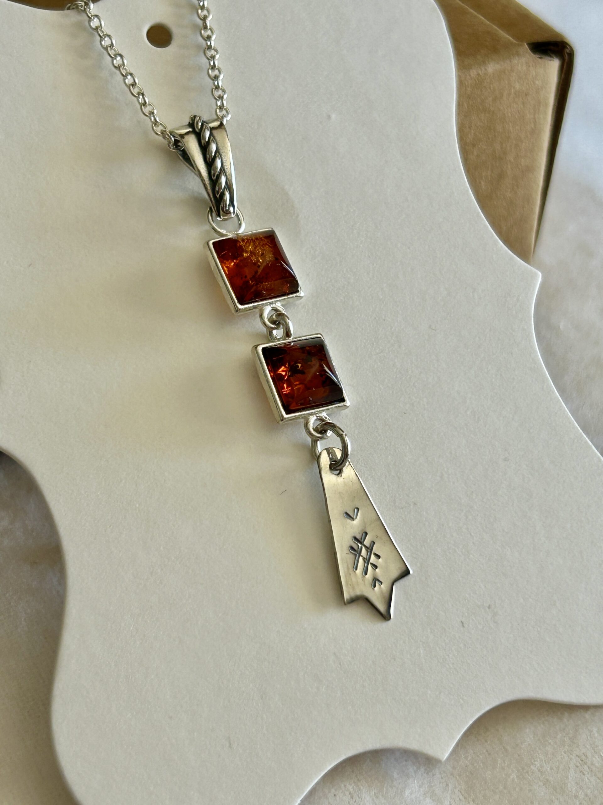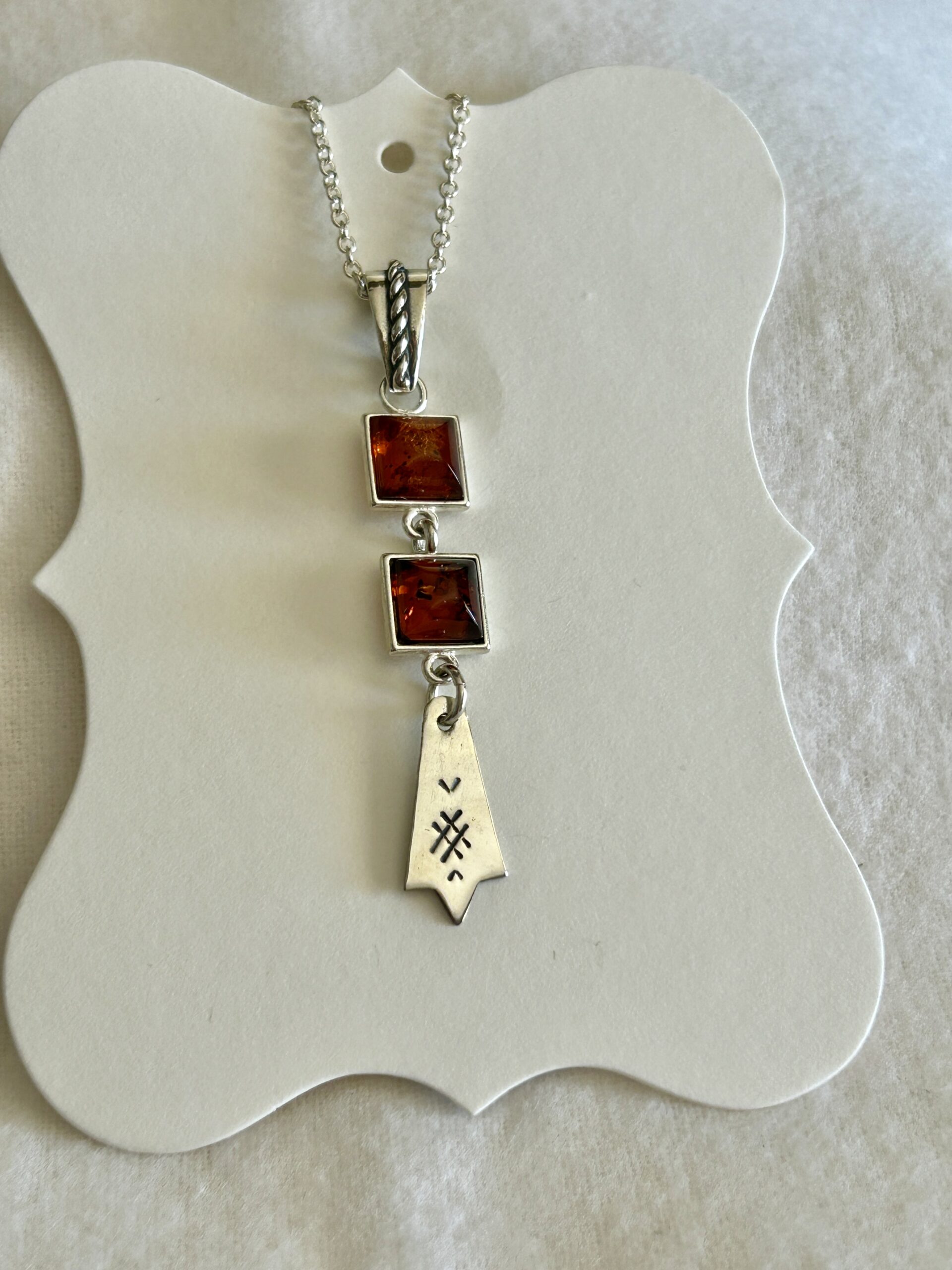The sterling silver pendant is approximately 2.25 inches long including the bail. Set with two (2) square Baltic ambers and enhanced with a pointed Baltic symbol charm.