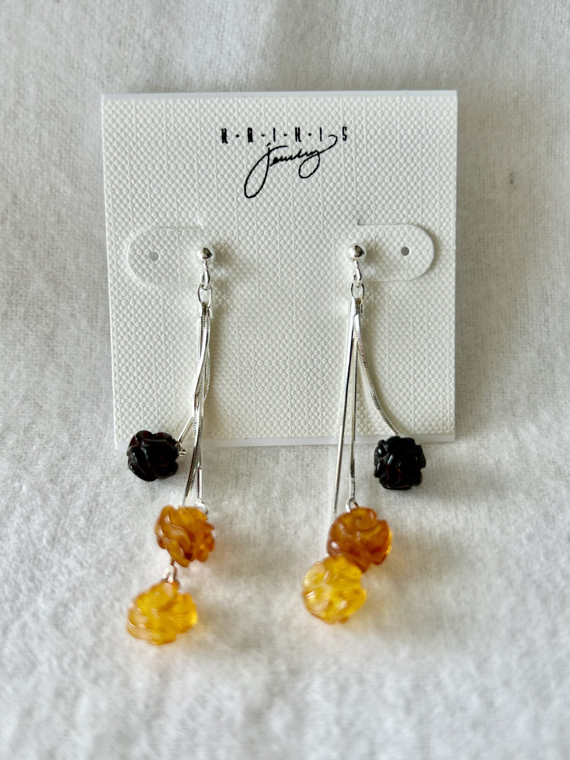 This pair of triple rose carved amber earrings are approximately 2.25 inches long.