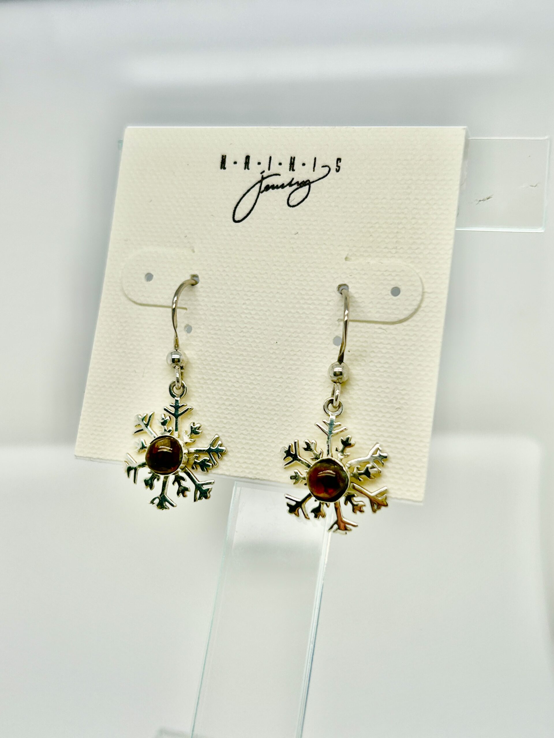 This pair of sterling silver Snowflake design earrings are set with Baltic cognac color amber. The earrings are approximately one (1) inch long.