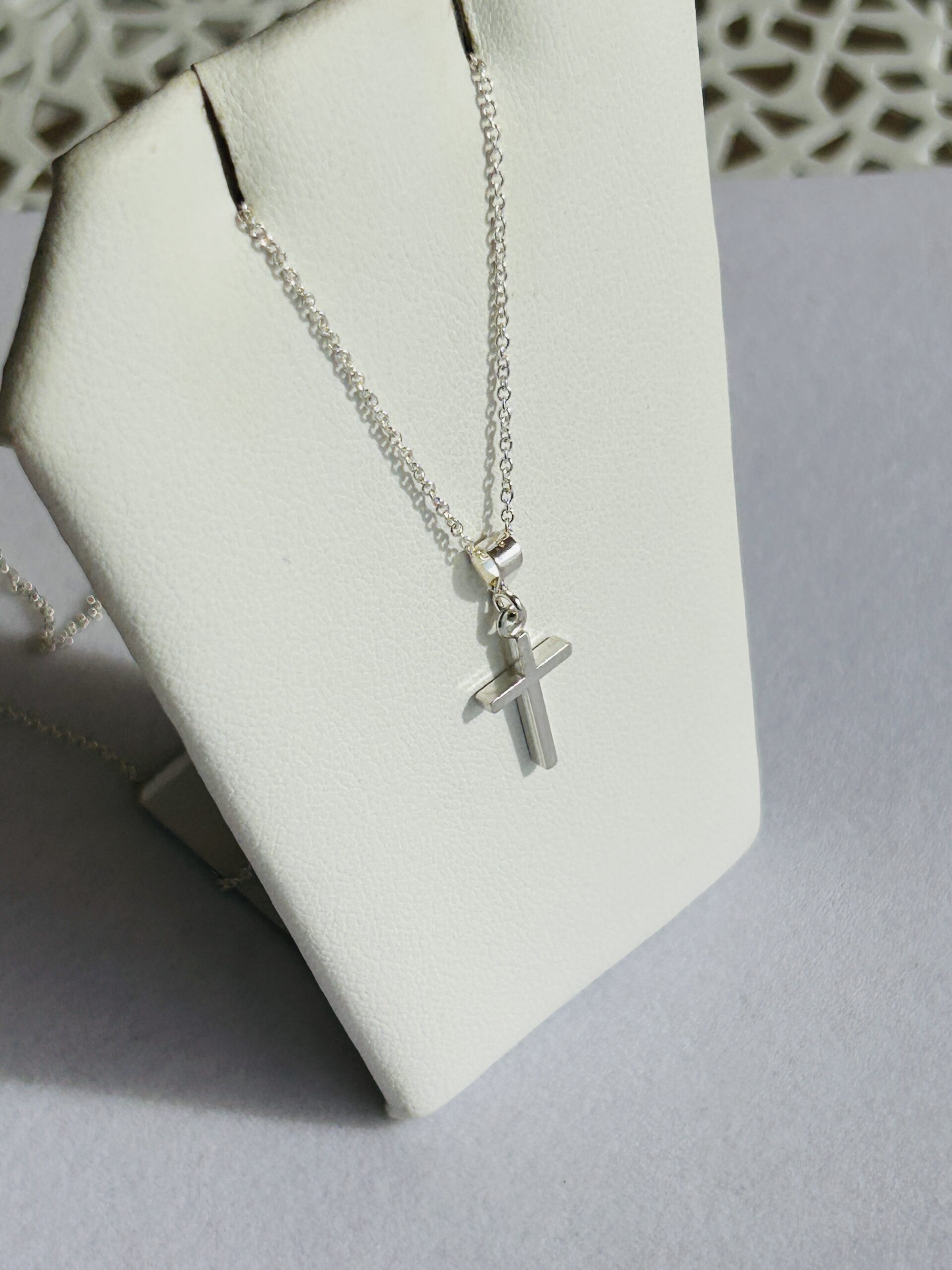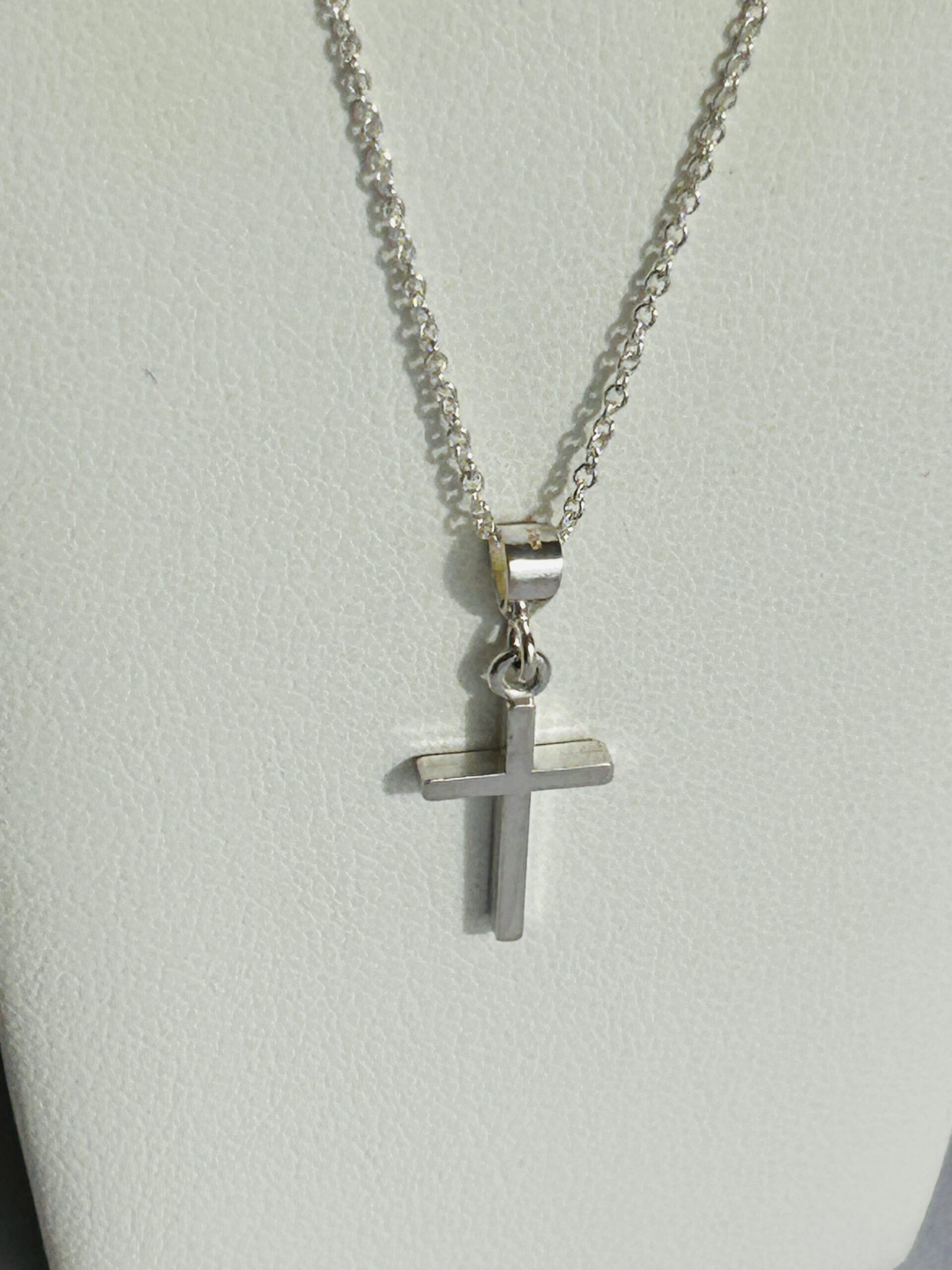 This sterling silver cross is approximately 12/16 inches long including the bail and comes with an eighteen (18) inch chain.
