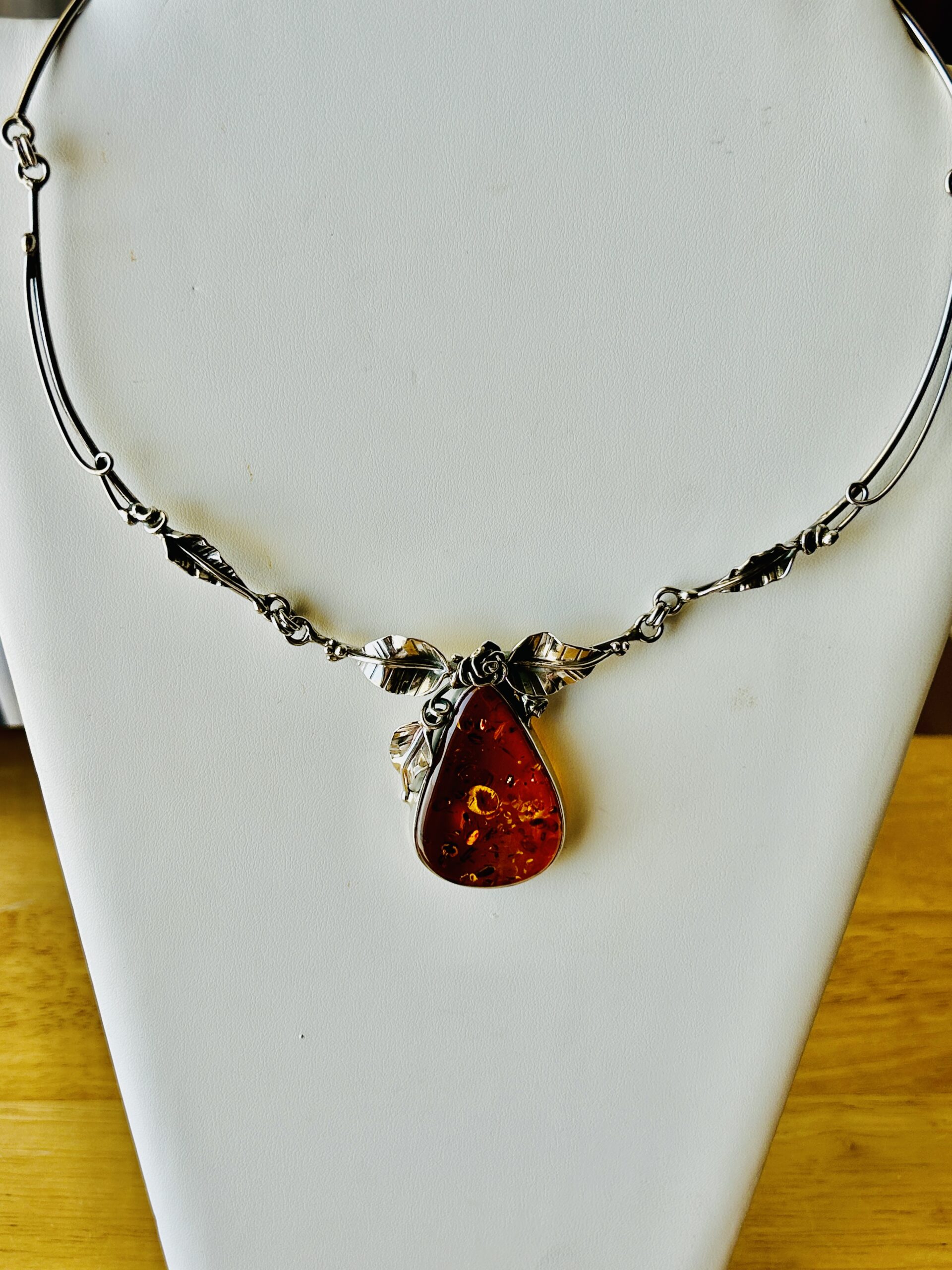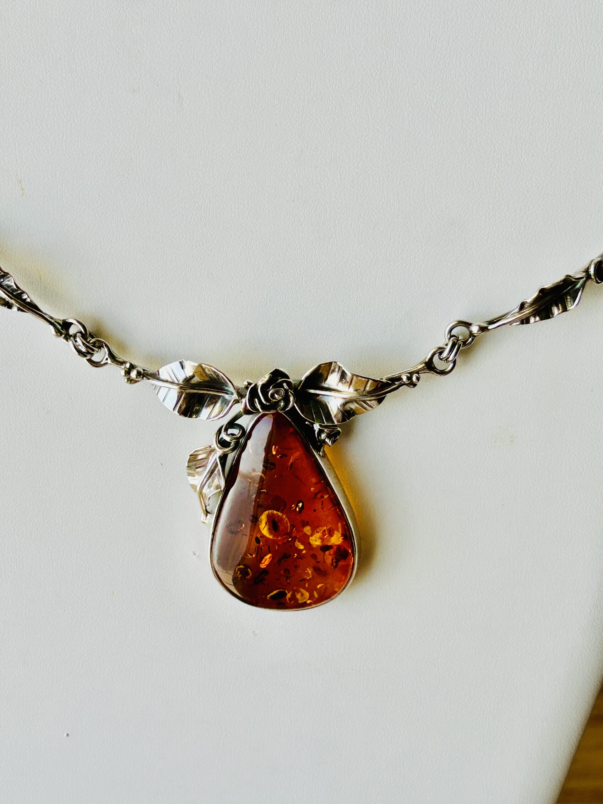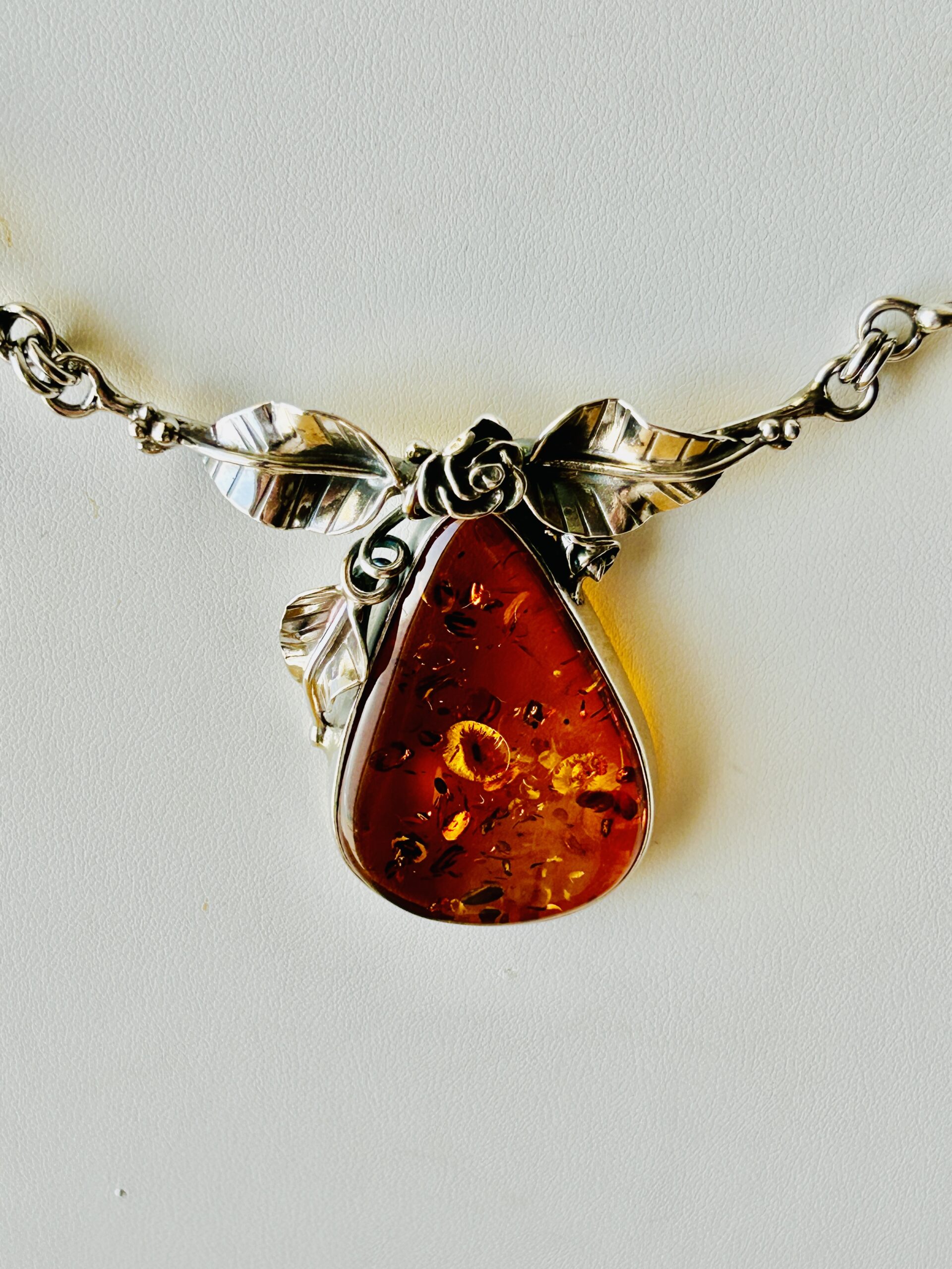 This sterling silver work of art has a stunning rose and leaf design. It is set with a large pear shaped, cognac color Baltic amber. The necklace is slightly adjustable from eighteen (18) inches to twenty (20) inches.