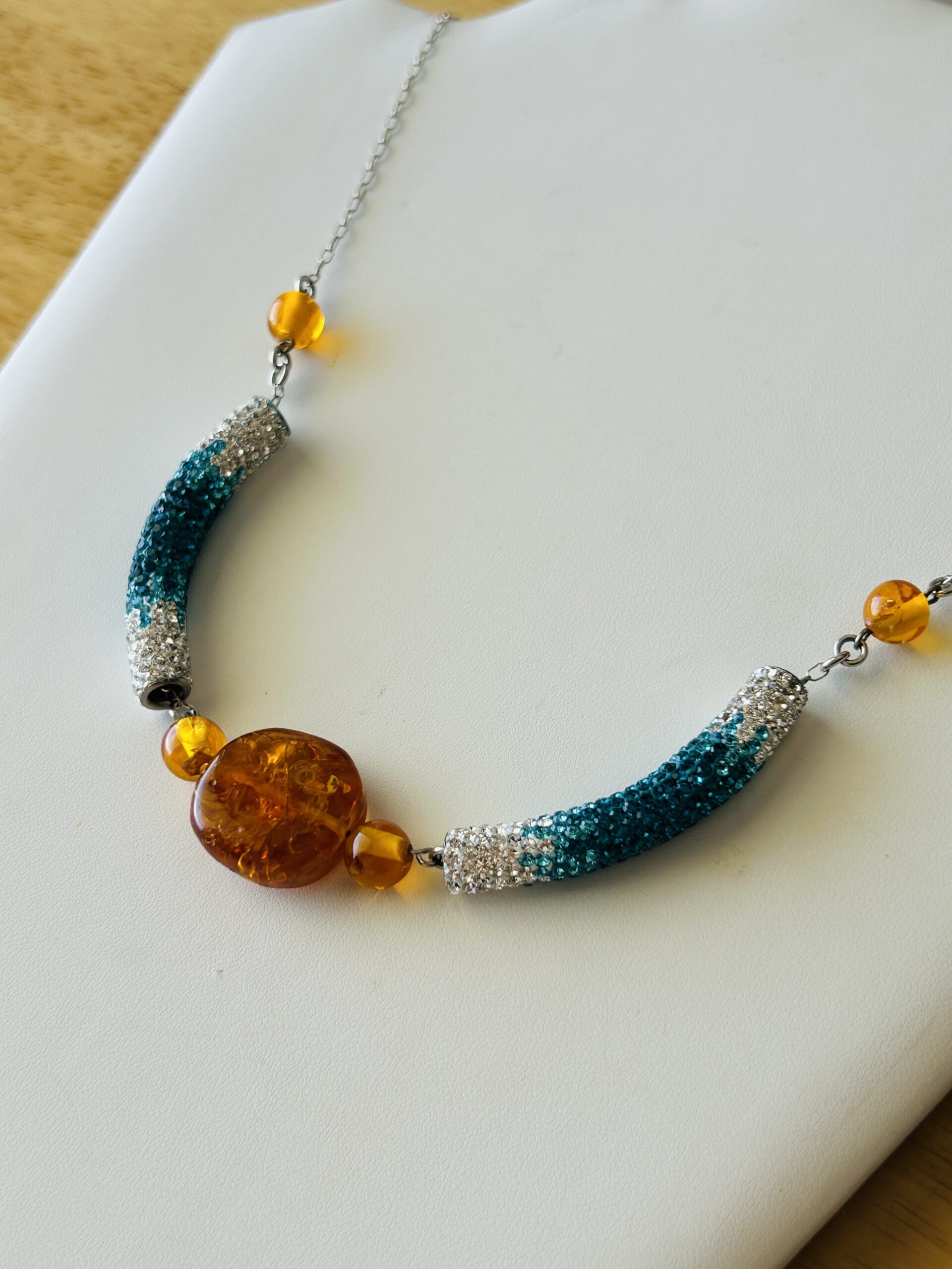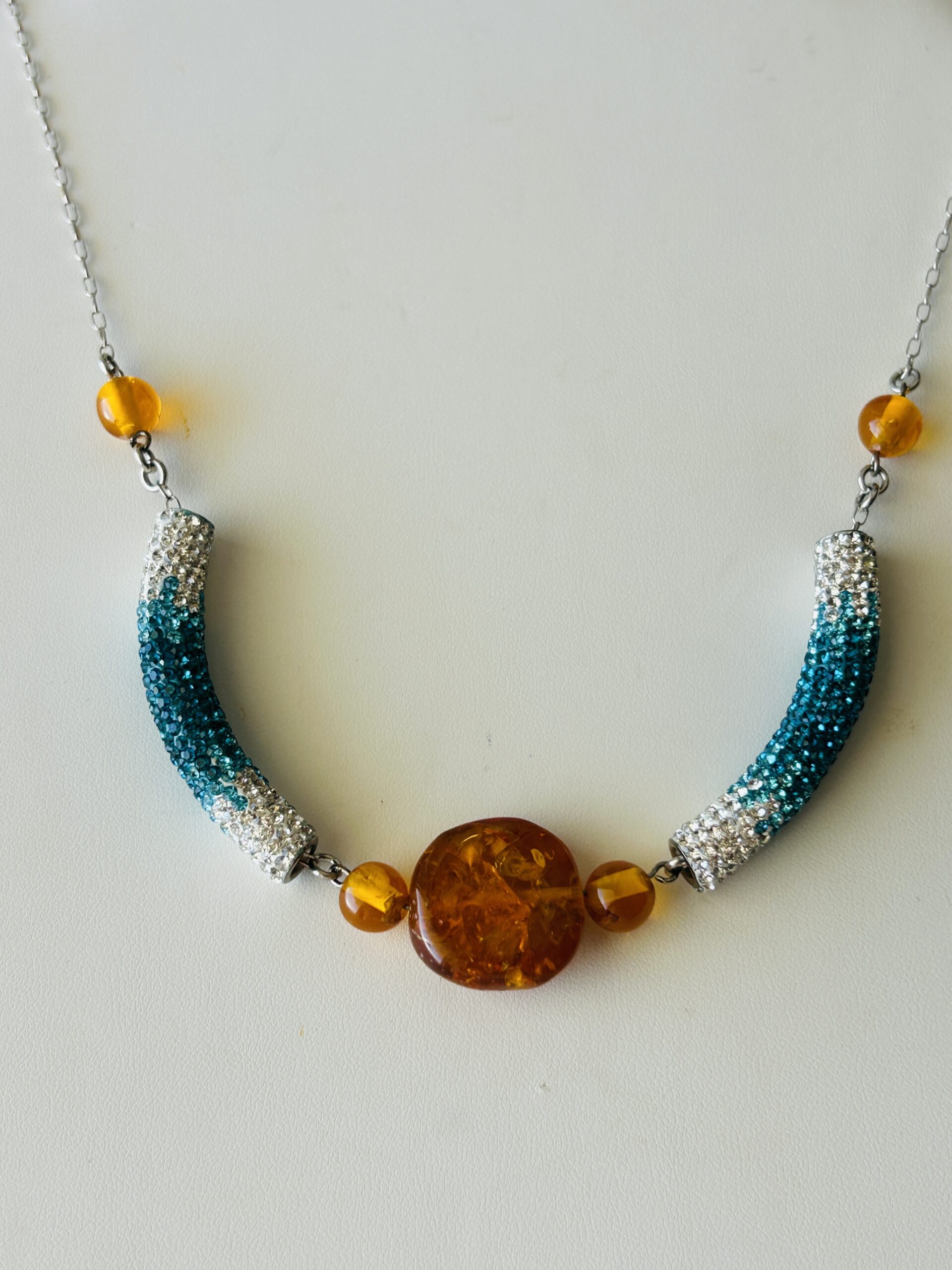 This beautiful necklace is approximately twenty-seven (27) inches long and has blue and clear Swarovski set beads. It is further enhanced by several Baltic honey-colored amber beads as well.