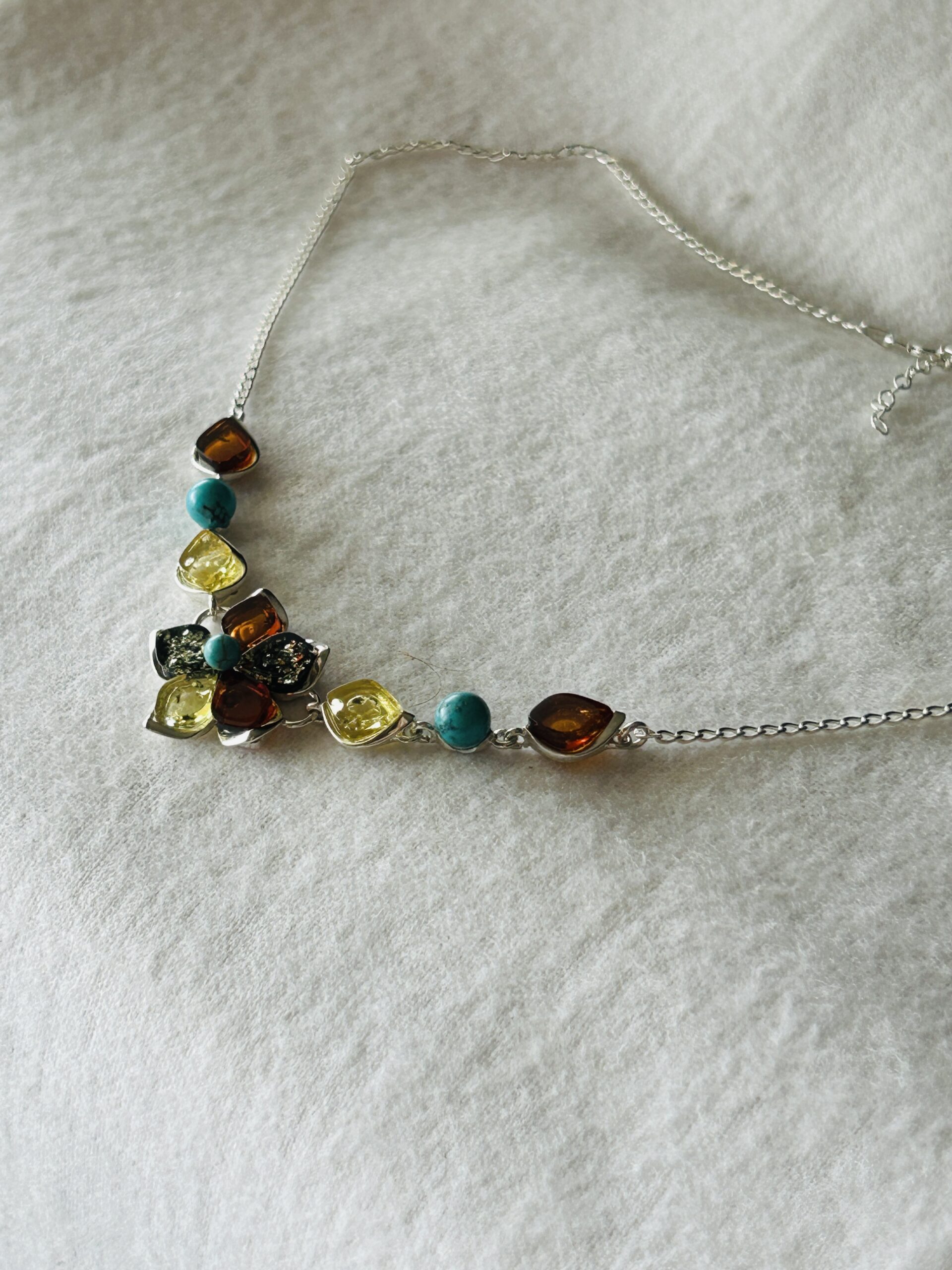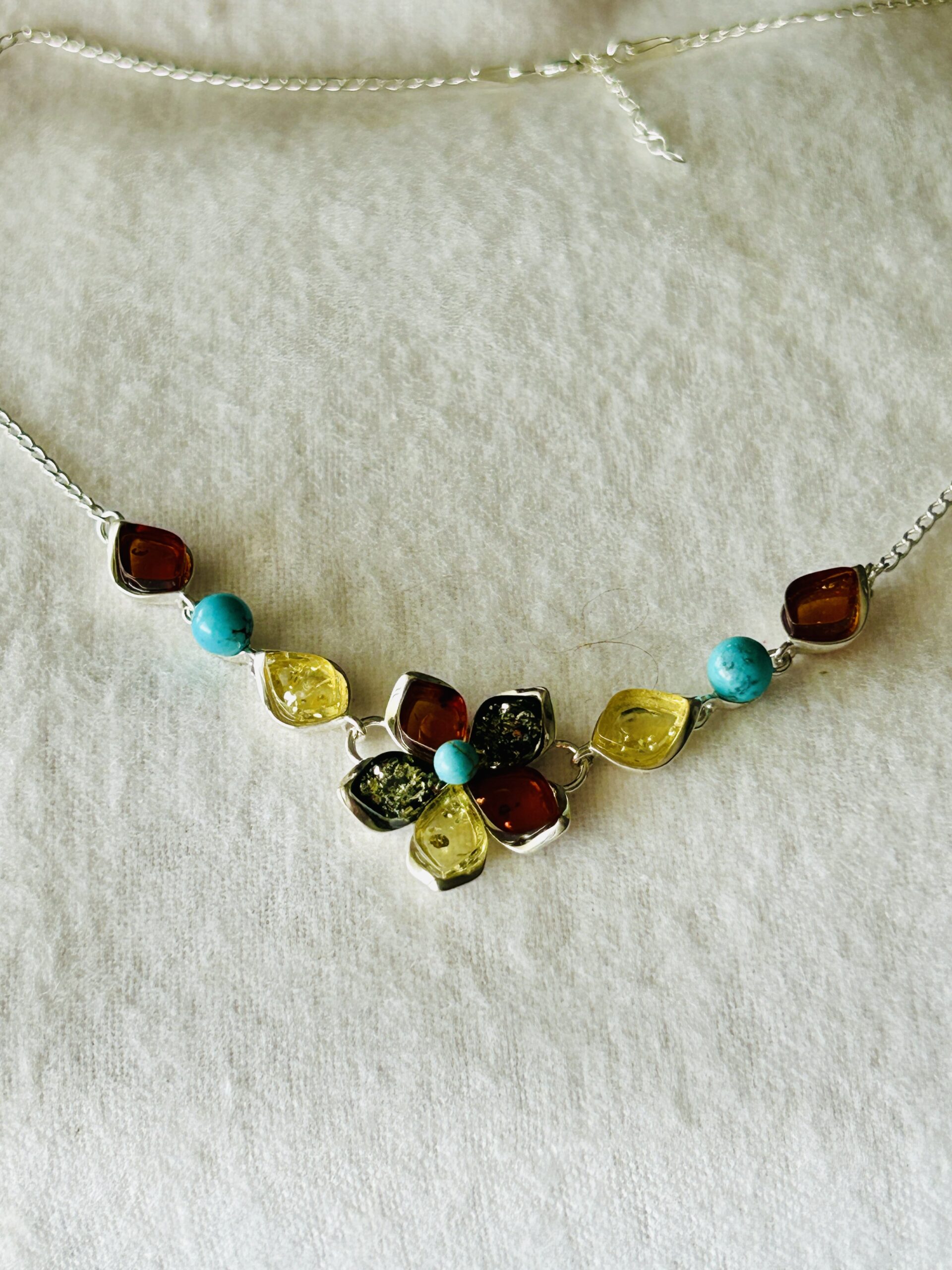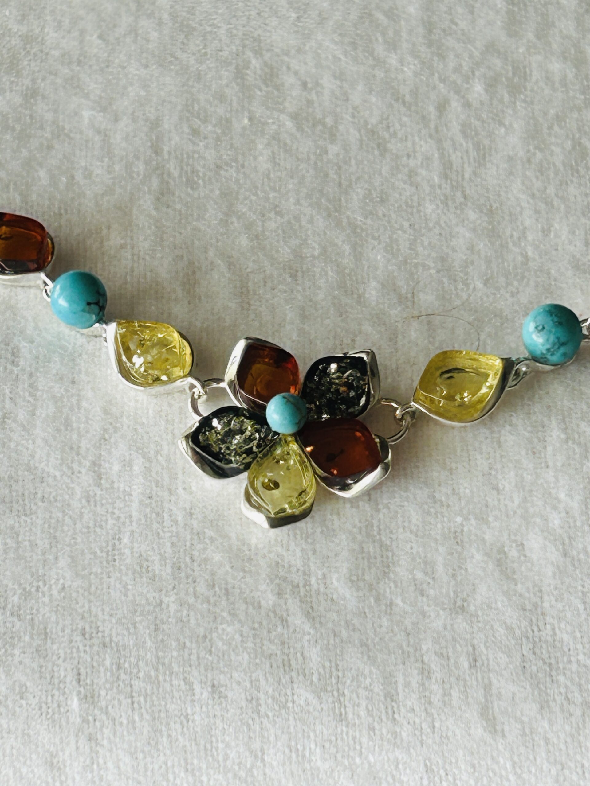 This exquisite sterling silver necklace is adjustable between eighteen and twenty inches and is set with nine (9) Baltic ambers and three (3) beautiful turquoise stones.