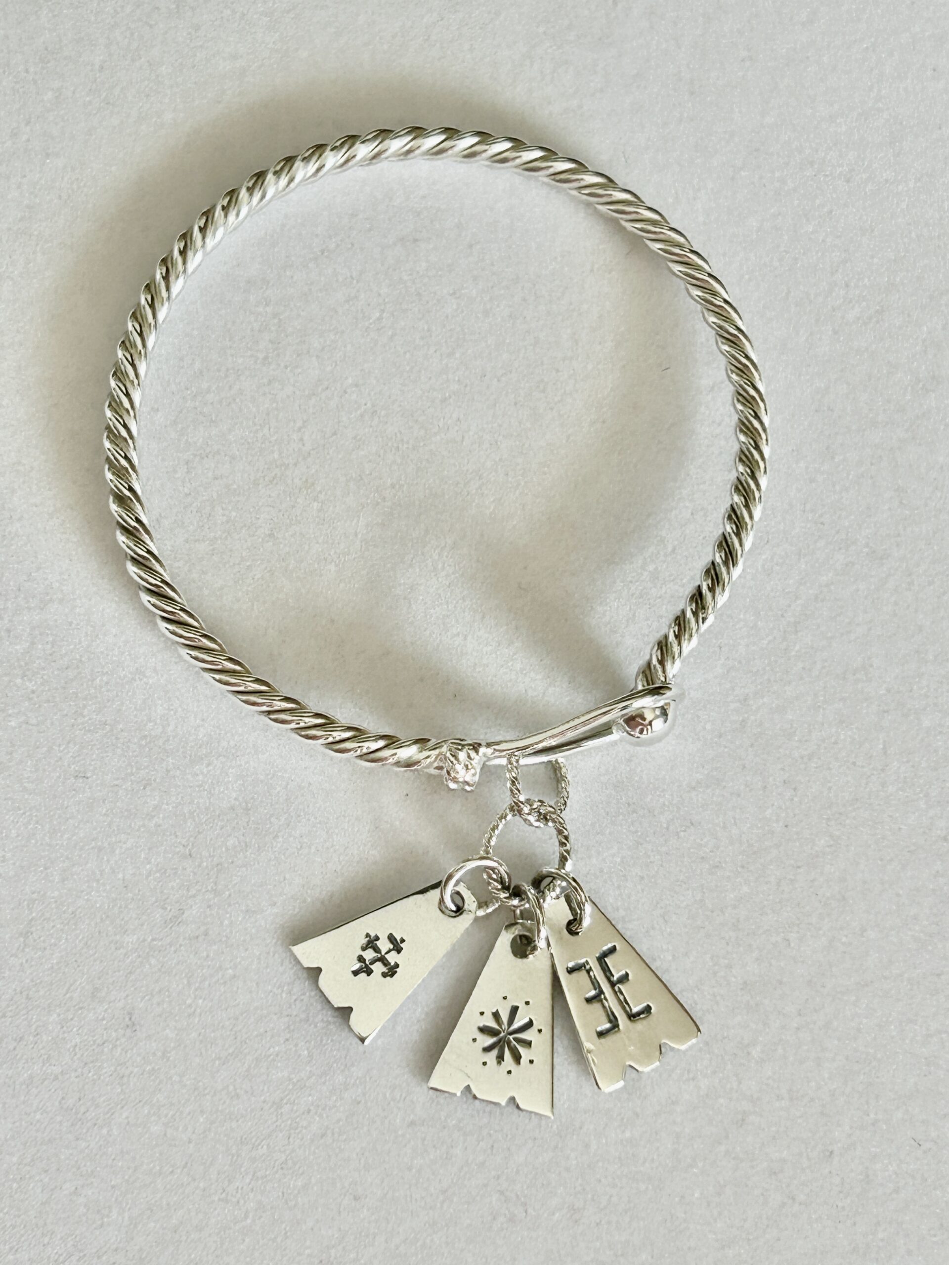 This lovely sterling silver twist bracelet has three (3) engraved Baltic symbol charms. The bracelet has an easy access clasp at the top.