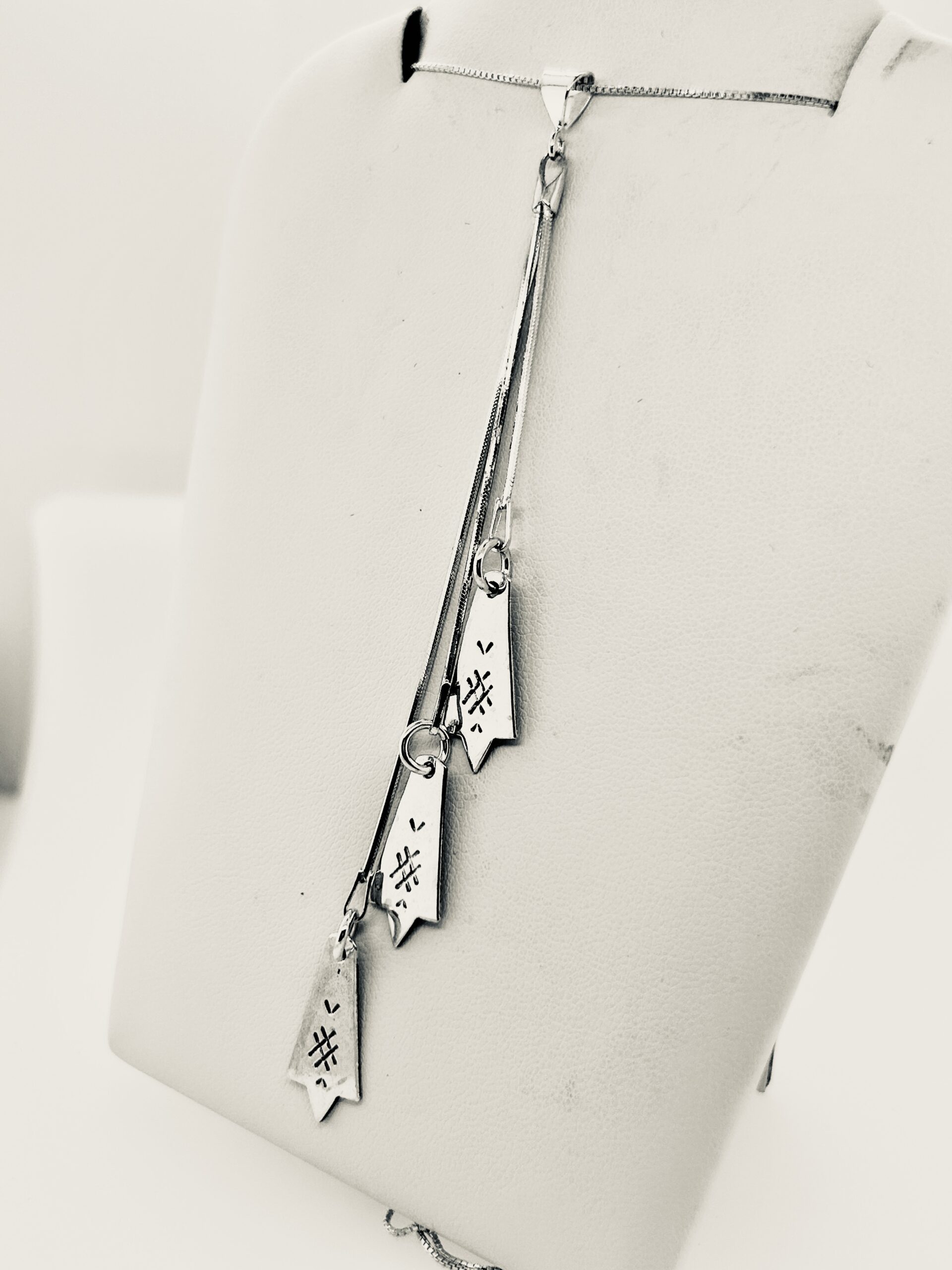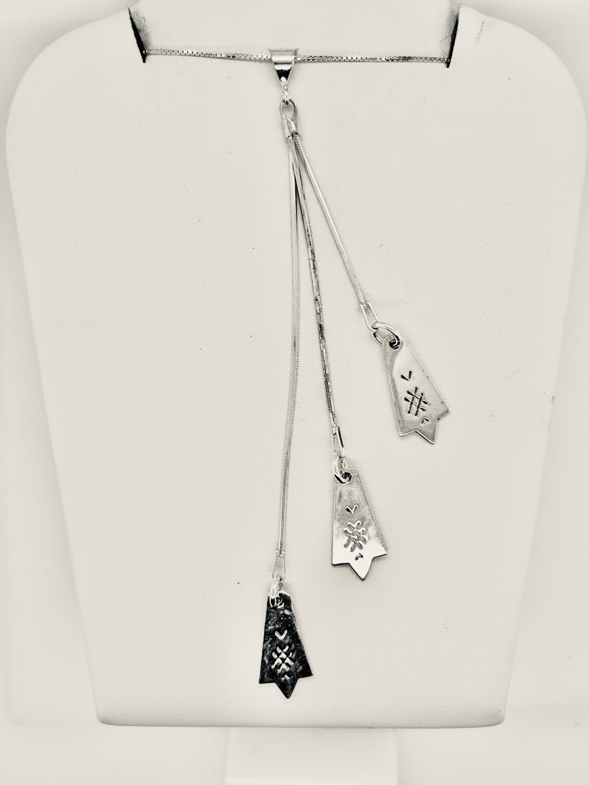 This beautiful sterling silver pendant has three long shiny sterling silver chains with three Baltic design charms. The pendant is approximately four (4) inches long including the bail.