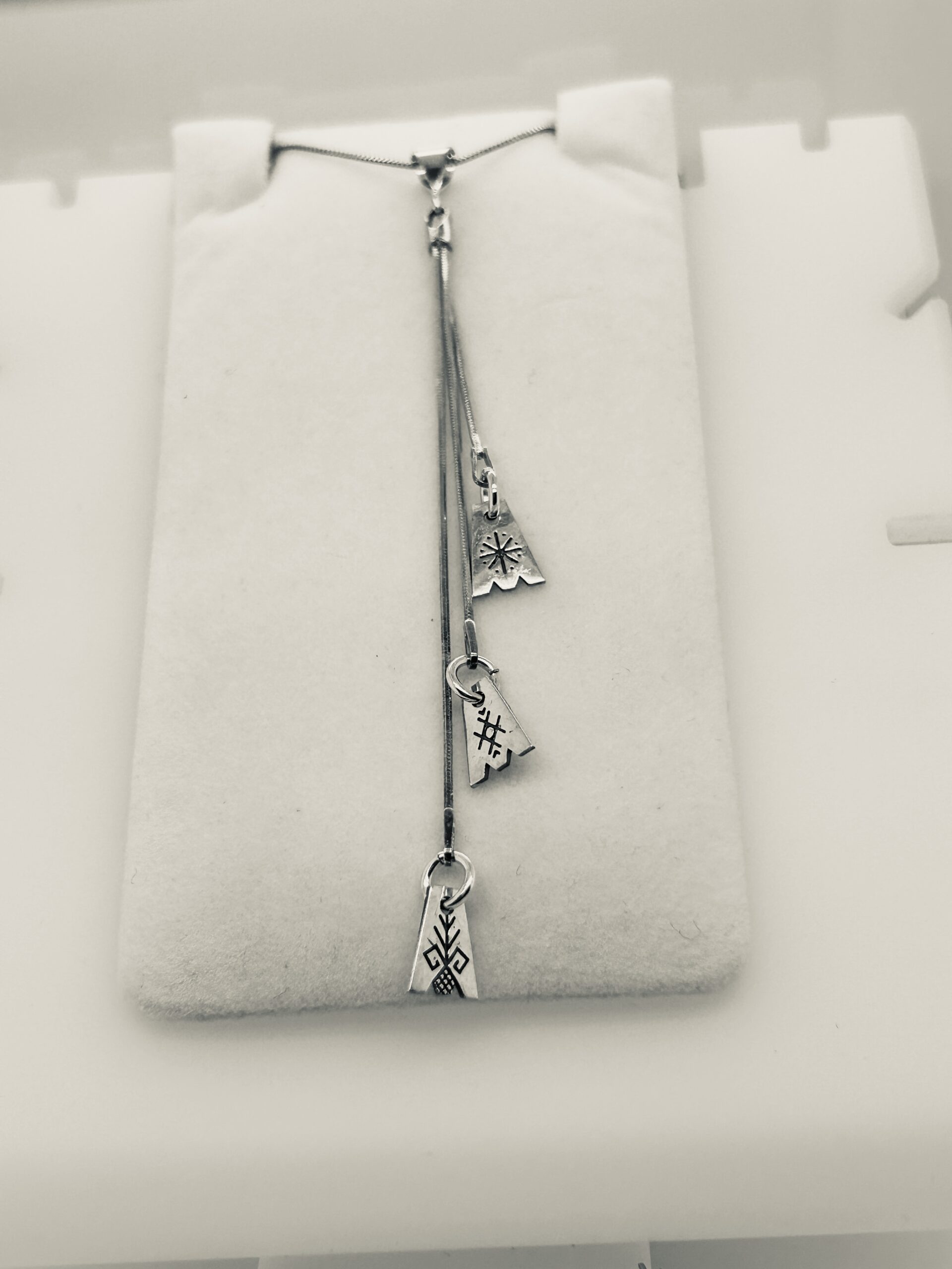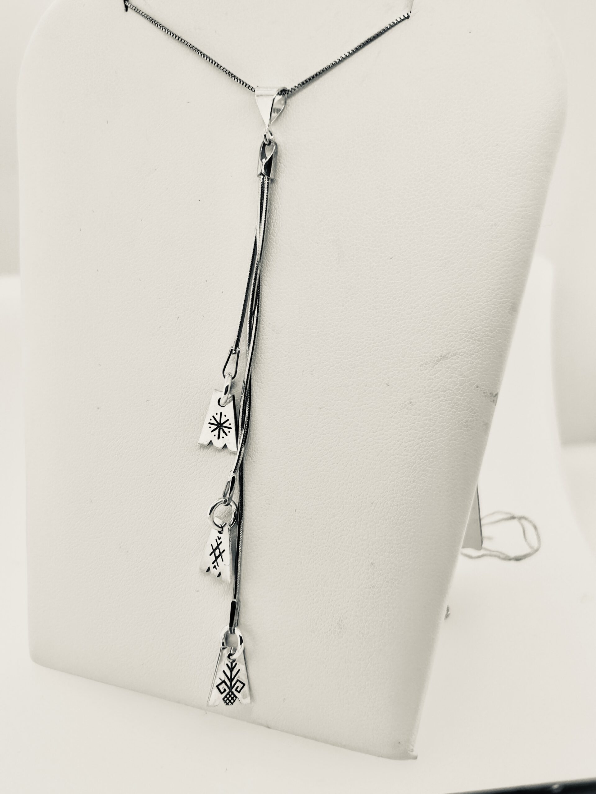 This sterling silver pendant has three chains with three small Baltic charms. The pendant is approximately 3.5 inches long excluding the bail.